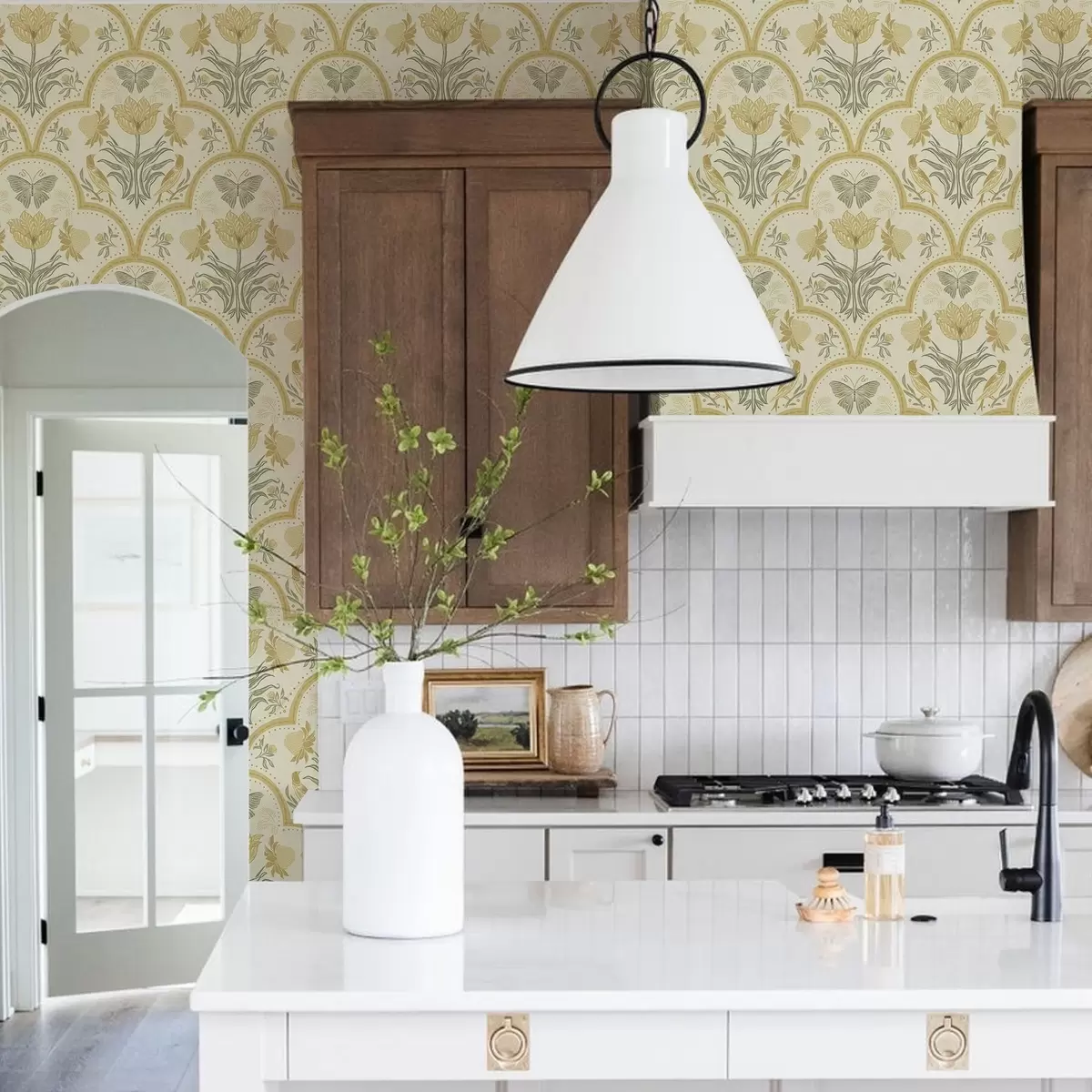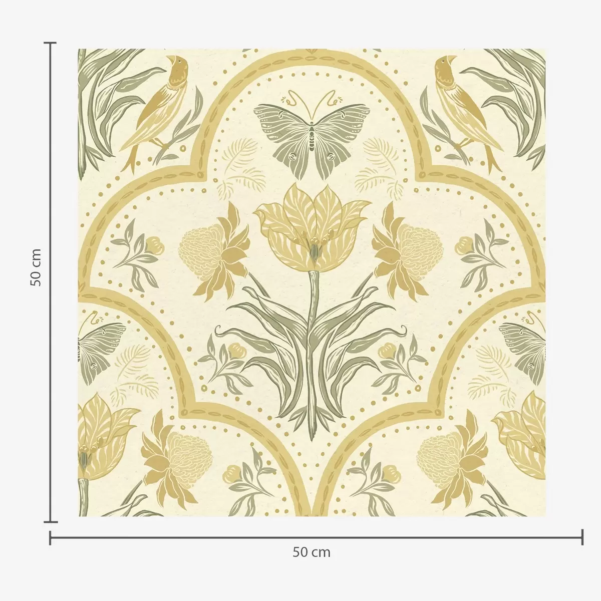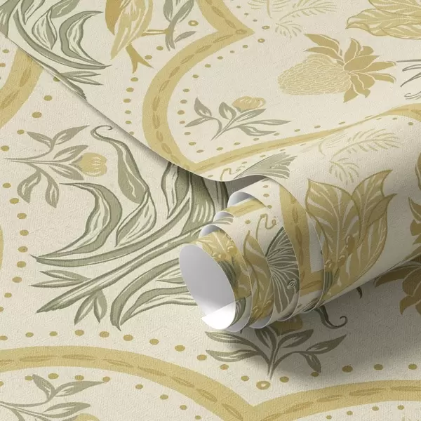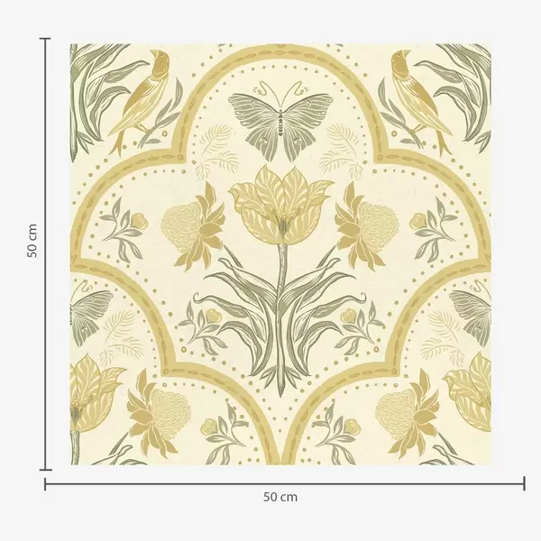Papel tapiz Adorno con tulipán, pájaros y mariposas, ocre Nr. a00722