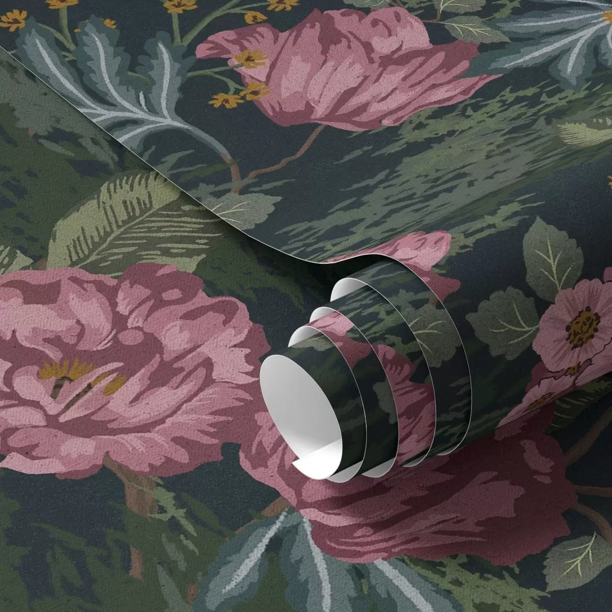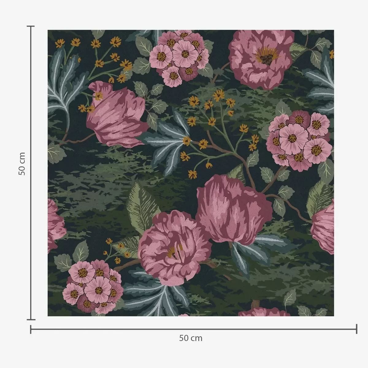 Papel tapiz Flora oscura con flores y hojas rosadas, fondo intenso Nr. a00724