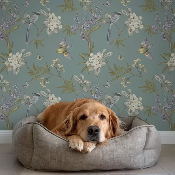 Papel tapiz Pájaros, flores y mariposas sobre un fondo azul grisáceo. Nr. a00735