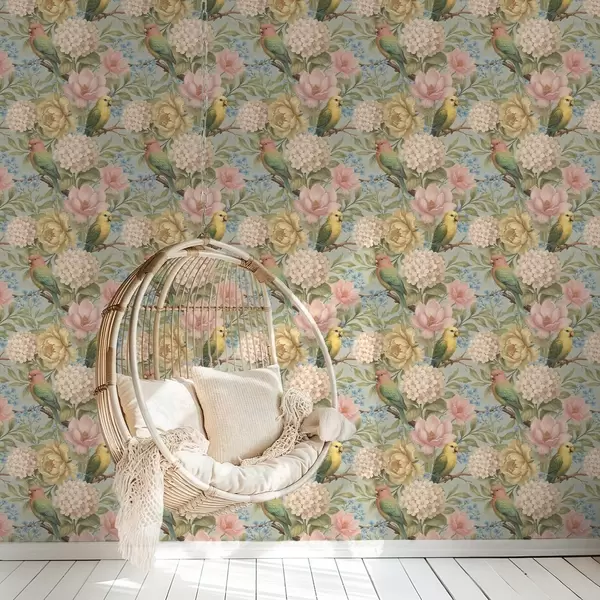 Papel tapiz Loros entre peonías, hortensias y magnolias Nr. a00747
