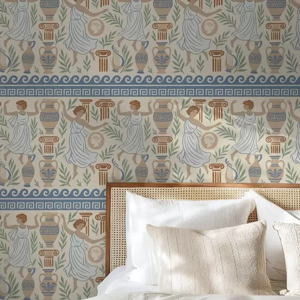 Papel pintado Adorno griego antiguo con figuras, jarrones y columnas a00768