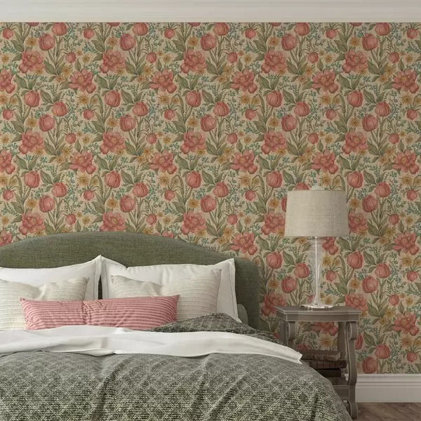 Papel pintado Tulipanes y ásteres vintage, fondo crema texturizado a00773