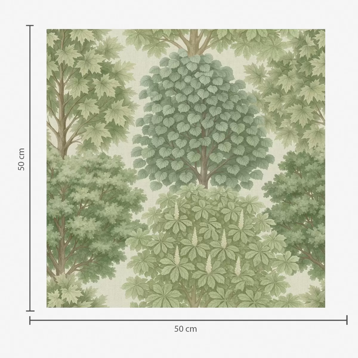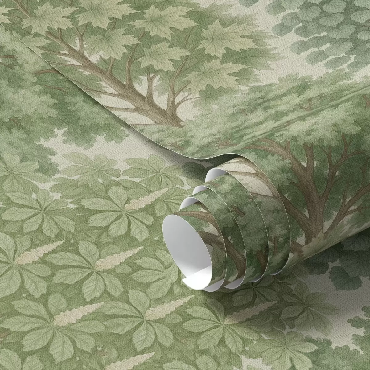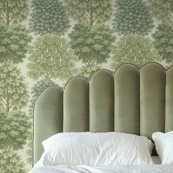 Papel tapiz Jardín de árboles en suaves tonos verdes sobre un fondo claro. Nr. a00775