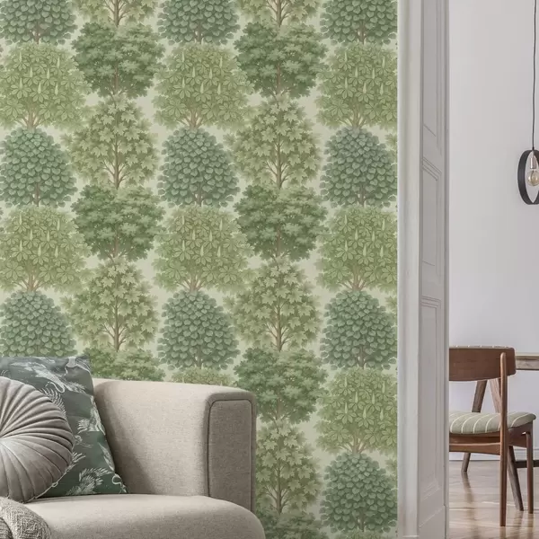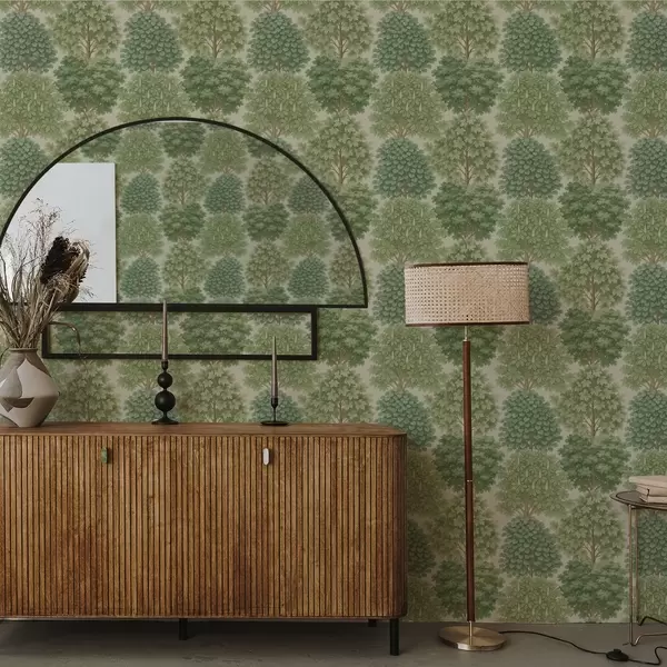 Papel tapiz Jardín de árboles en suaves tonos verdes sobre un fondo claro. Nr. a00775