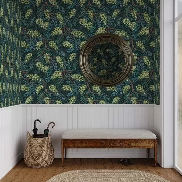 Papel pintado Ramas con inflorescencias verdosas sobre fondo oscuro a00786