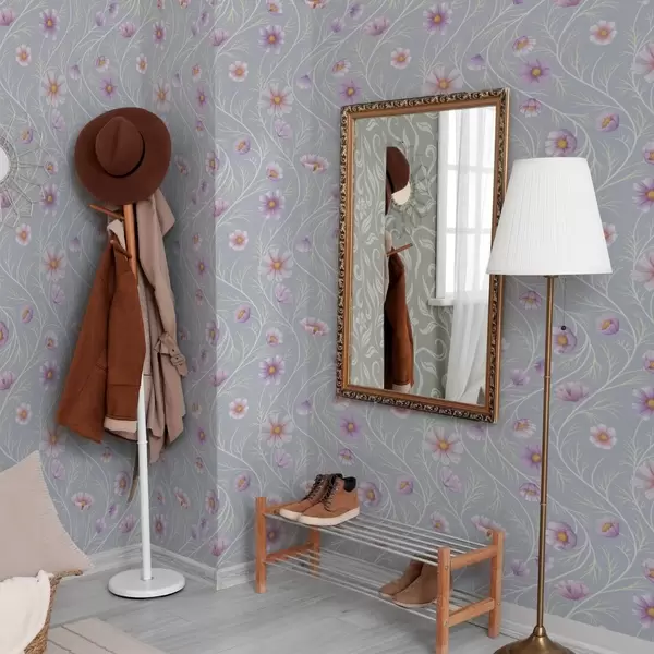 Papel tapiz Cosmos rosados y tallos delgados sobre fondo gris Nr. a00791
