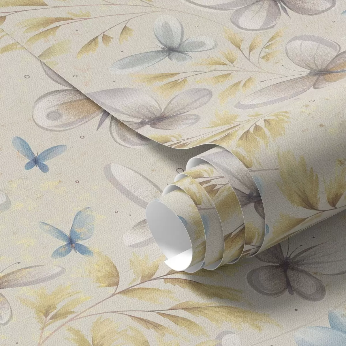 Papel tapiz Mariposas ligeras entre hojas amarillas sobre un fondo claro. Nr. a00795