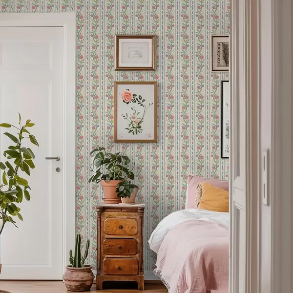 Papel tapiz Rayas con capullos de coral sobre fondo crema claro. Nr. a00816v1