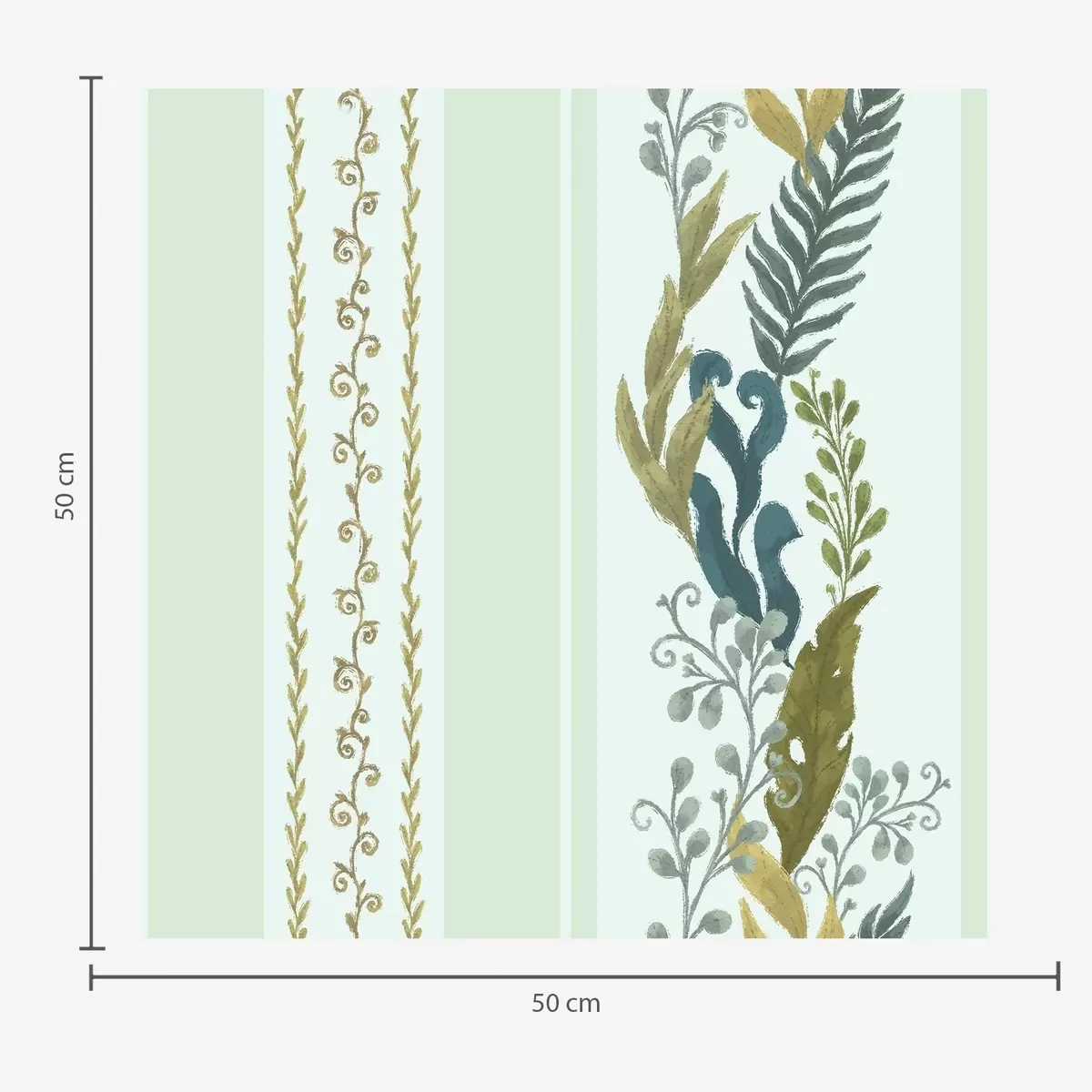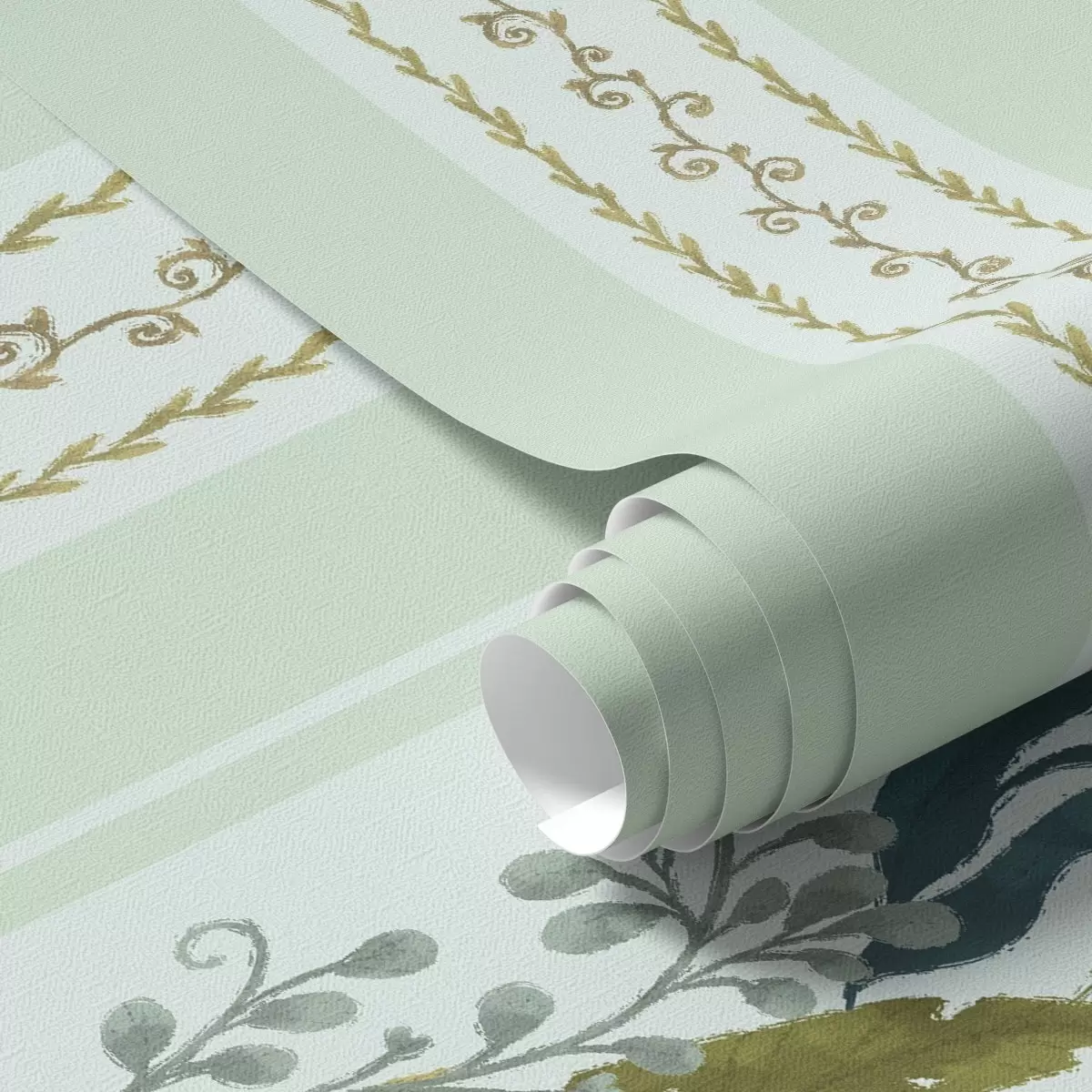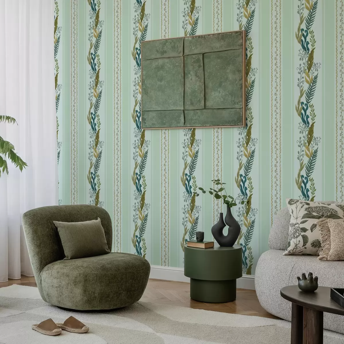 Papel tapiz Rayas anchas con ramas pictóricas sobre un suave fondo menta. Nr. a00825v1