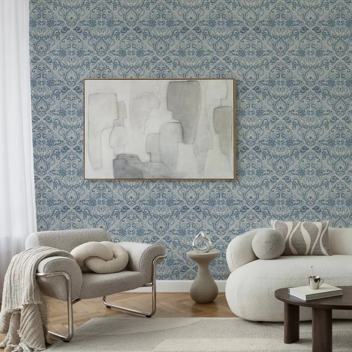 Papel tapiz Damasco clásico, motivos azules sobre fondo crema. Nr. a00826v1