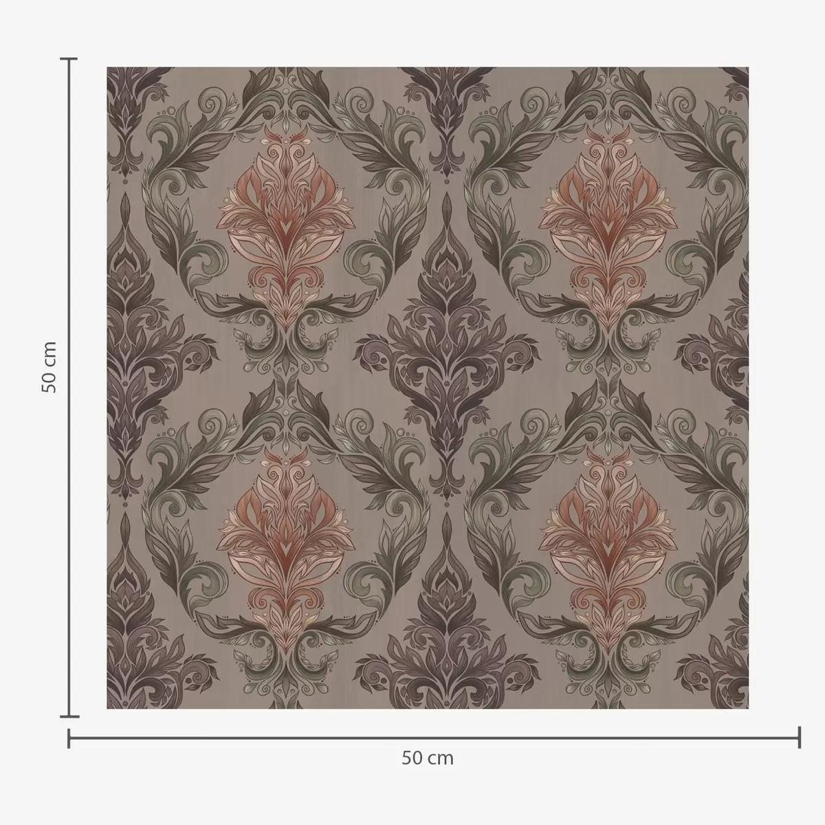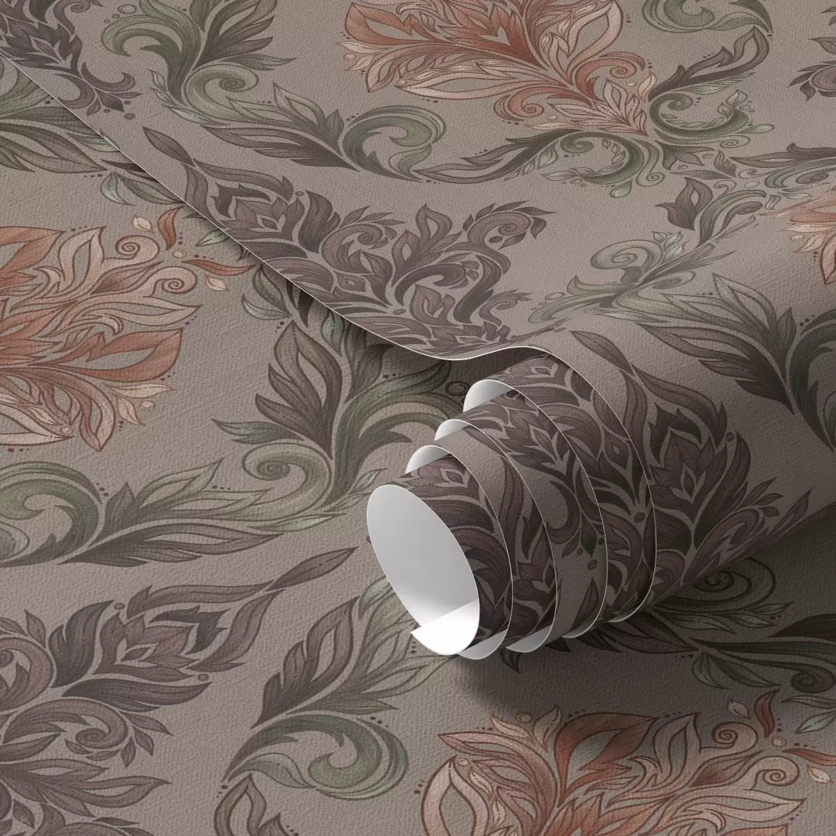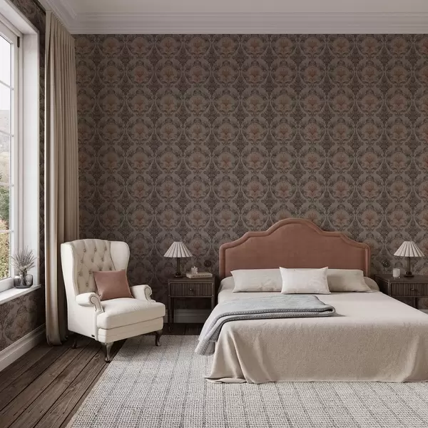 Papel pintado Damasco en tonos marrón-terracota, fondo gris cálido. a00828v2
