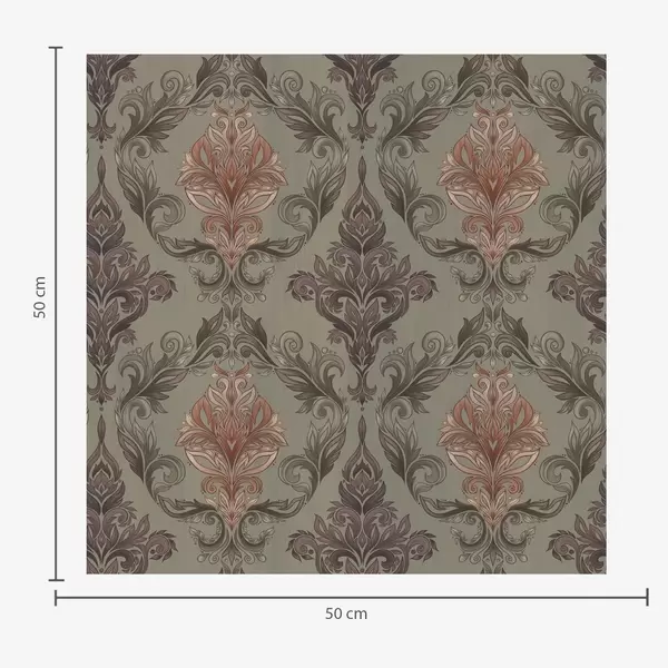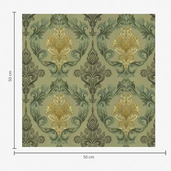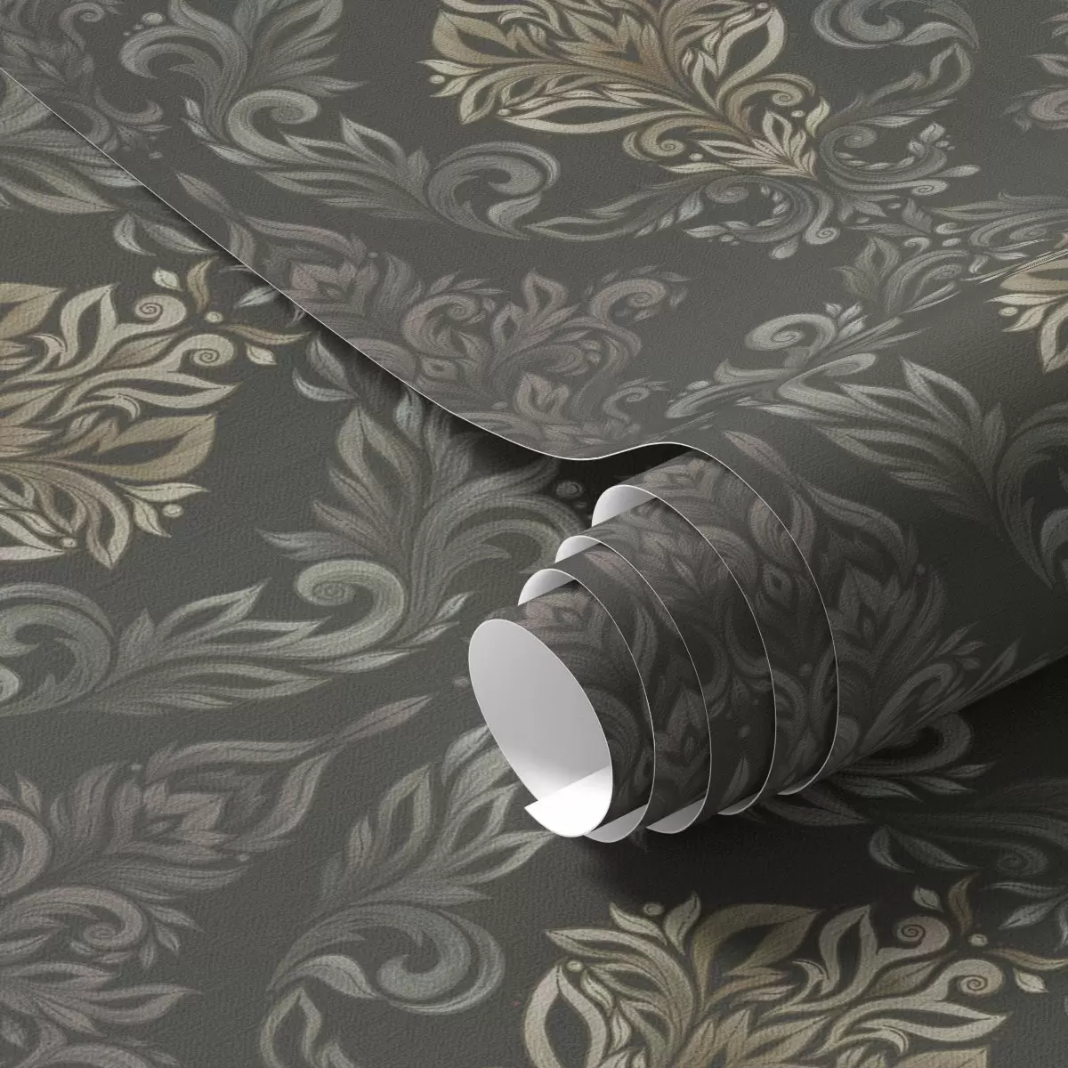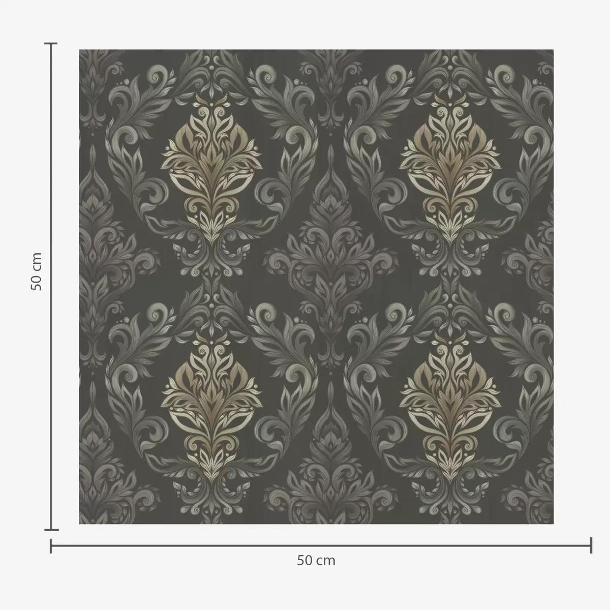 Papel tapiz Damasco sobre fondo grafito oscuro, detalles en ocre oliva. Nr. a00828v5