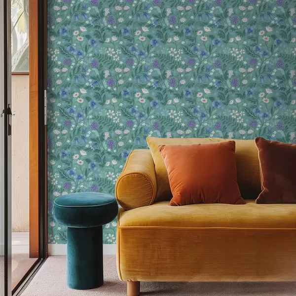 Papel tapiz Flores silvestres y bayas sobre un suave fondo menta Nr. a00849