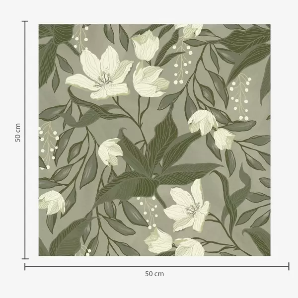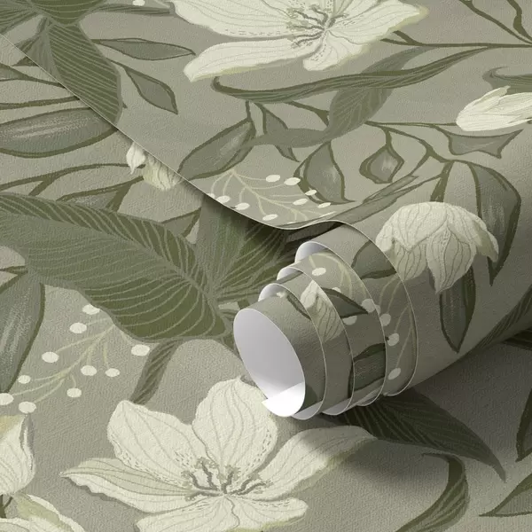 Papel tapiz Lirios pálidos y follaje sobre fondo gris oliva. Nr. a00854