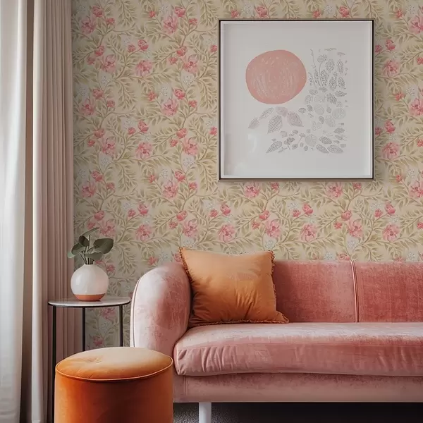 Papel tapiz Flores rosas, flores blancas y follaje en tonos ocres Nr. a00855