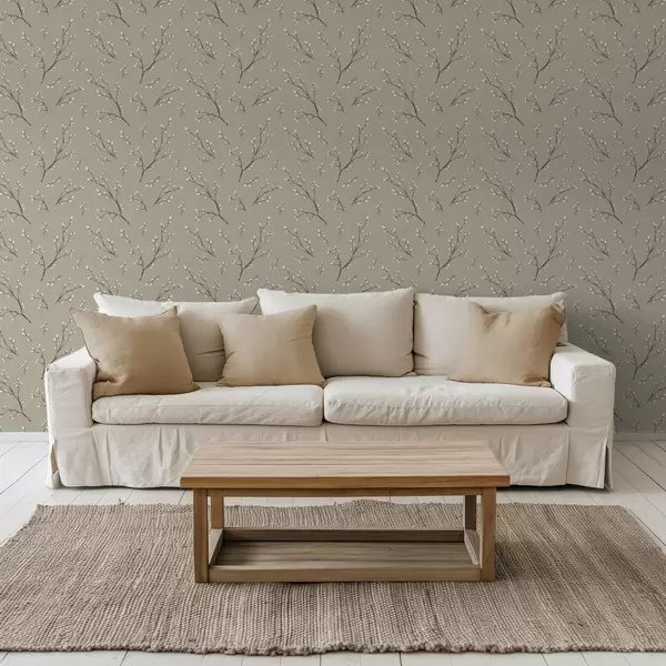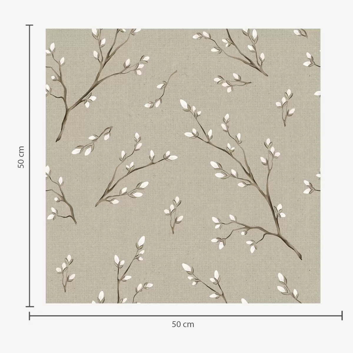 Papel tapiz Ramitas con brotes blancos sobre fondo gris topo lino Nr. a00861