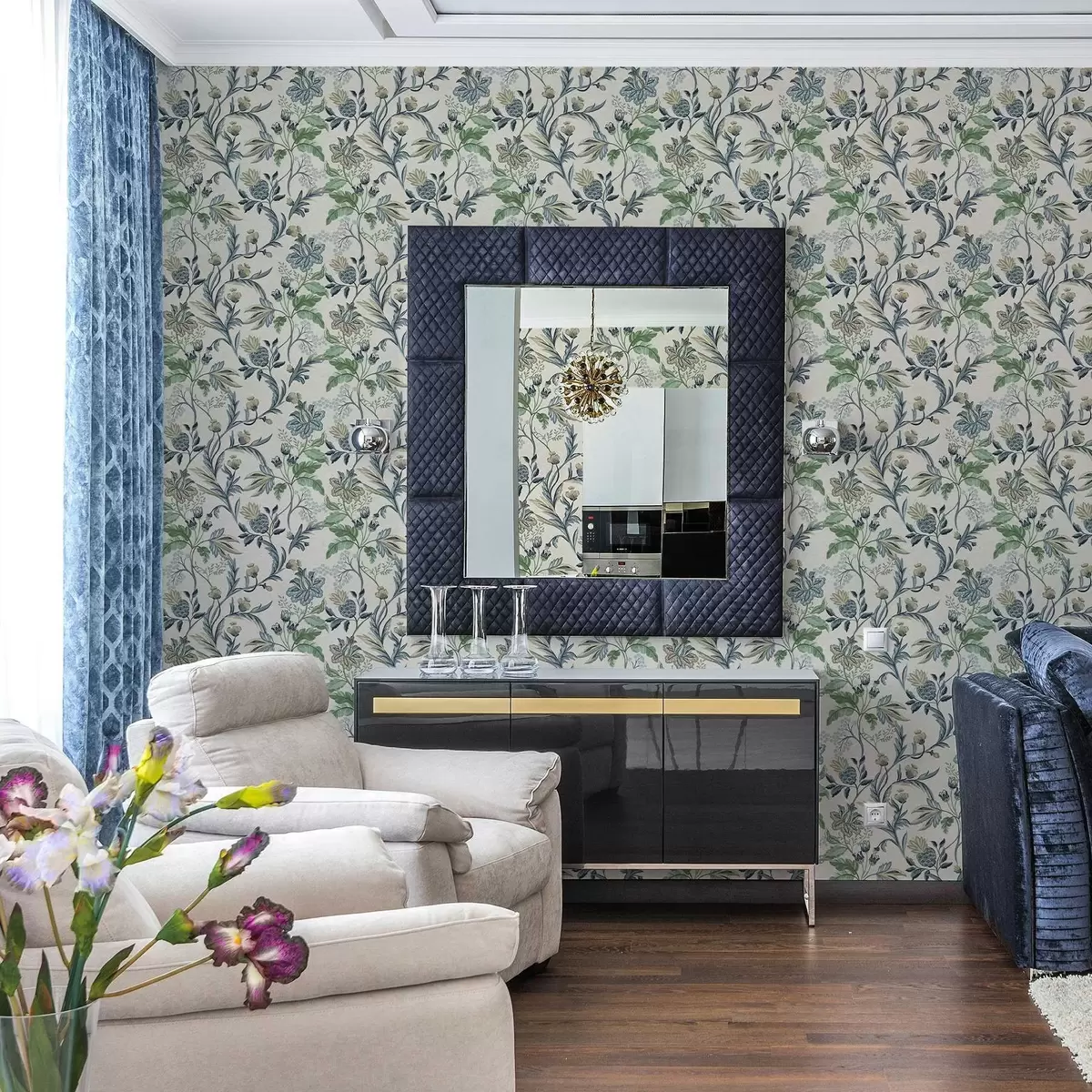 Papel tapiz Flores y hojas folk azul verdosas sobre fondo crema Nr. a00863