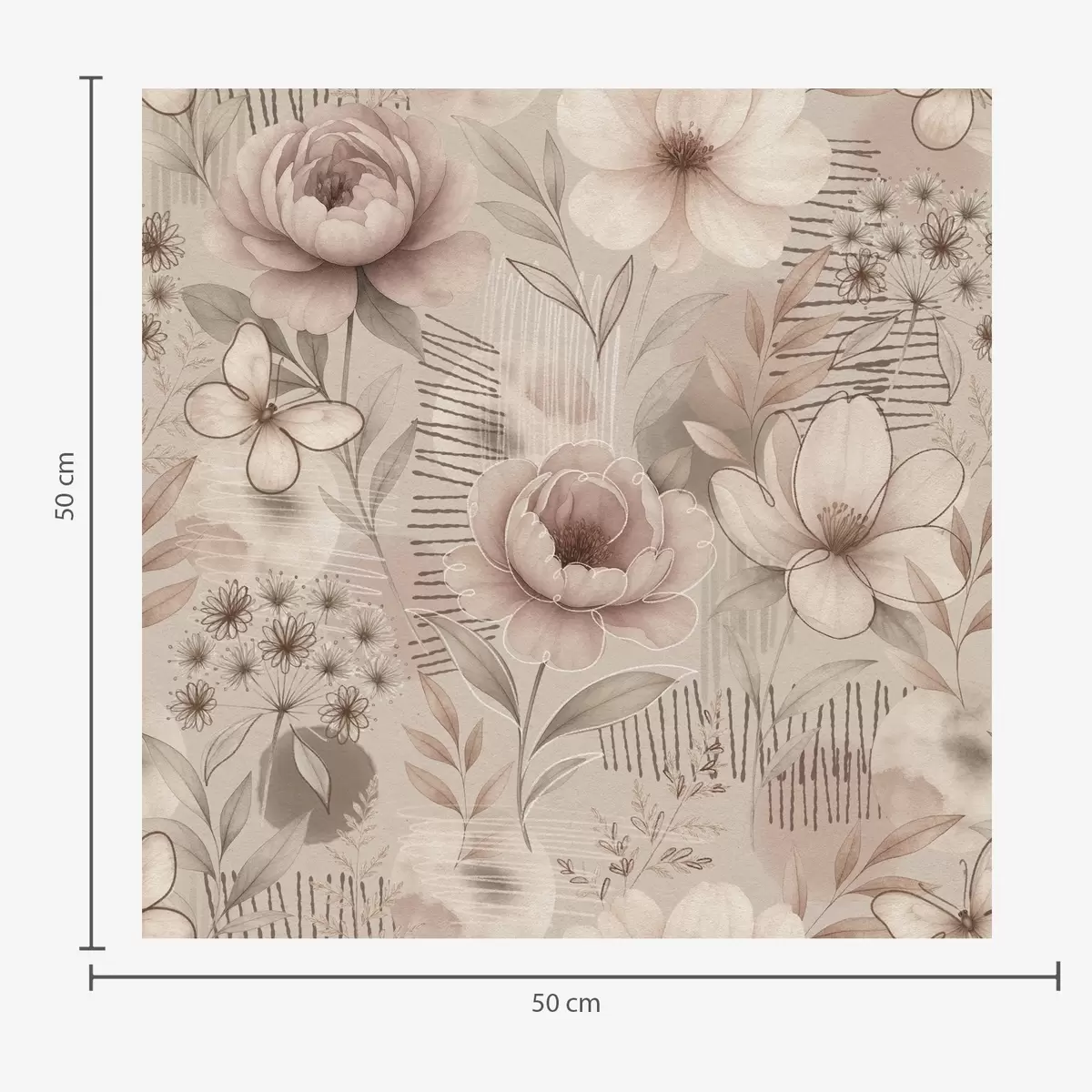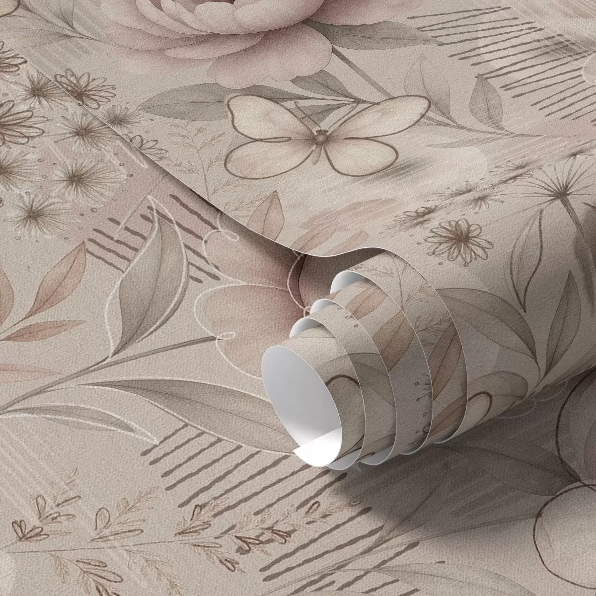 Papel tapiz Estampado floral en tonos beige sepia con detalles lineales y mariposas. Nr. a00870