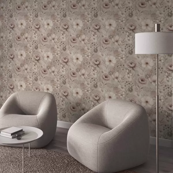 Papel tapiz Estampado floral en tonos beige sepia con detalles lineales y mariposas. Nr. a00870