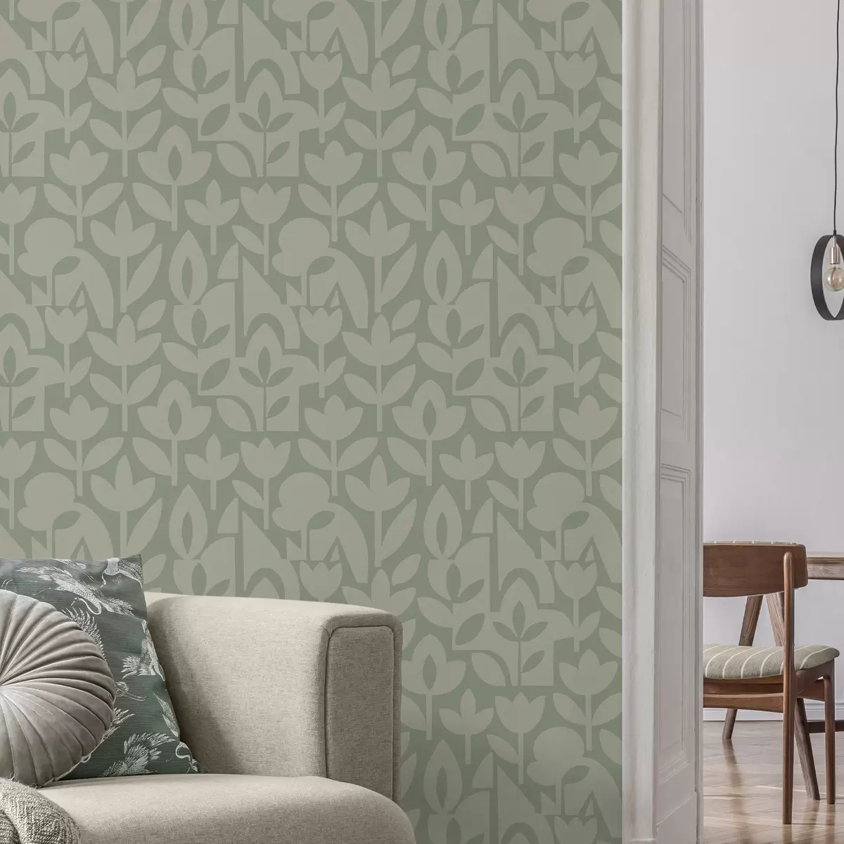 Papel tapiz Siluetas florales geométricas en suave color salvia. Nr. a00875v1