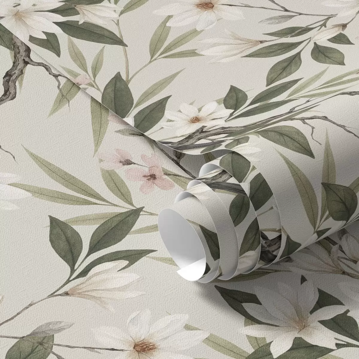 Papel tapiz Pintassilgos con el pecho blanco posados en ramas con flores color crema. Nr. a00889