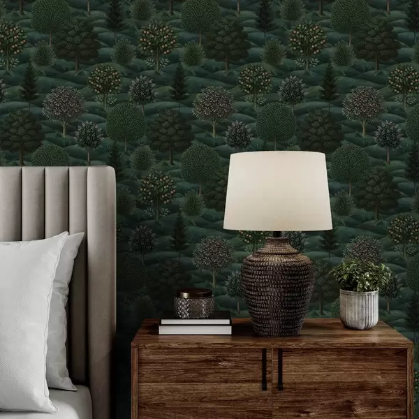 Papel pintado Paisaje ondulado de un verde intenso con árboles dispuestos en patrones a00892