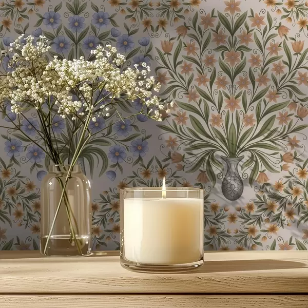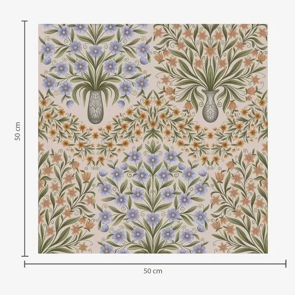 Papel tapiz Jarrones alternados y flores azules en salvia sobre rosa pálido. Nr. a00901
