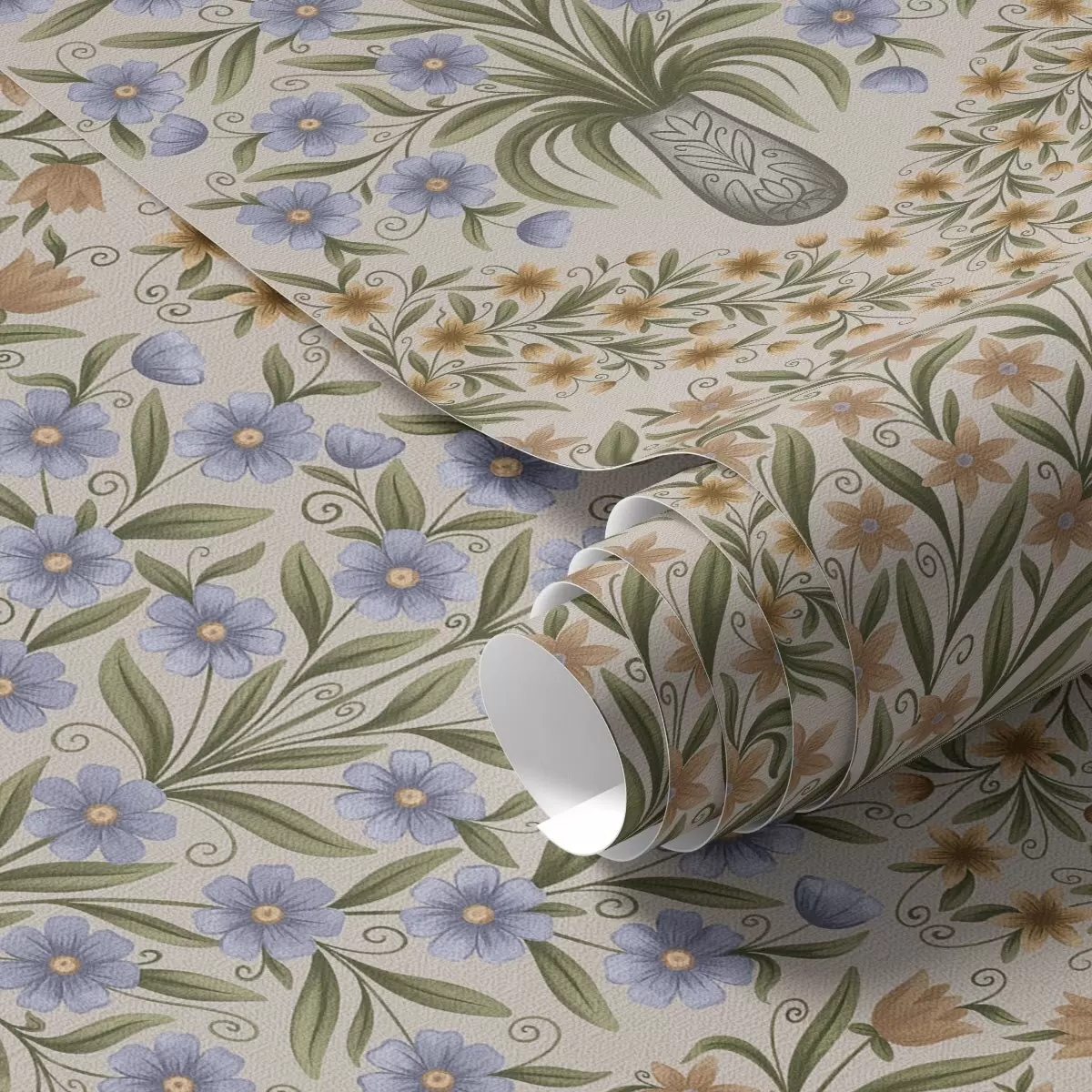 Papel pintado Jarrones alternados y flores azules en salvia sobre rosa pálido. a00901
