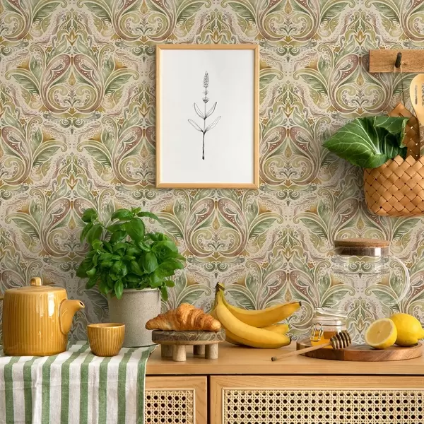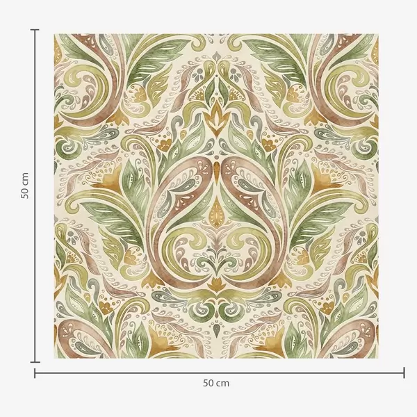 Papel tapiz Remolinos de hojas en acuarela en tonos verdes y ocres cálidos. Nr. a00927