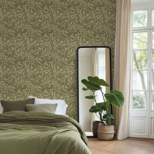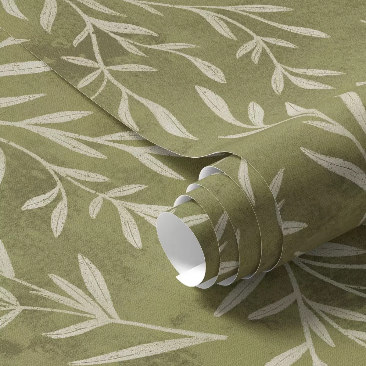 Papel tapiz Ramitas de color blanco crema sobre un fondo cálido con textura oliva. Nr. a00936v1