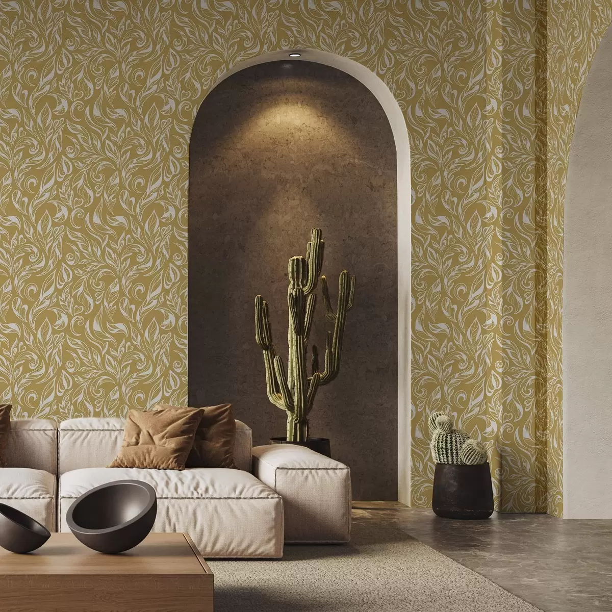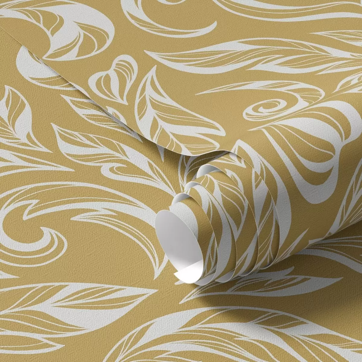 Papel tapiz Adorno foliado de color blanco crema sobre un fondo ocre cálido. Nr. a00940v1