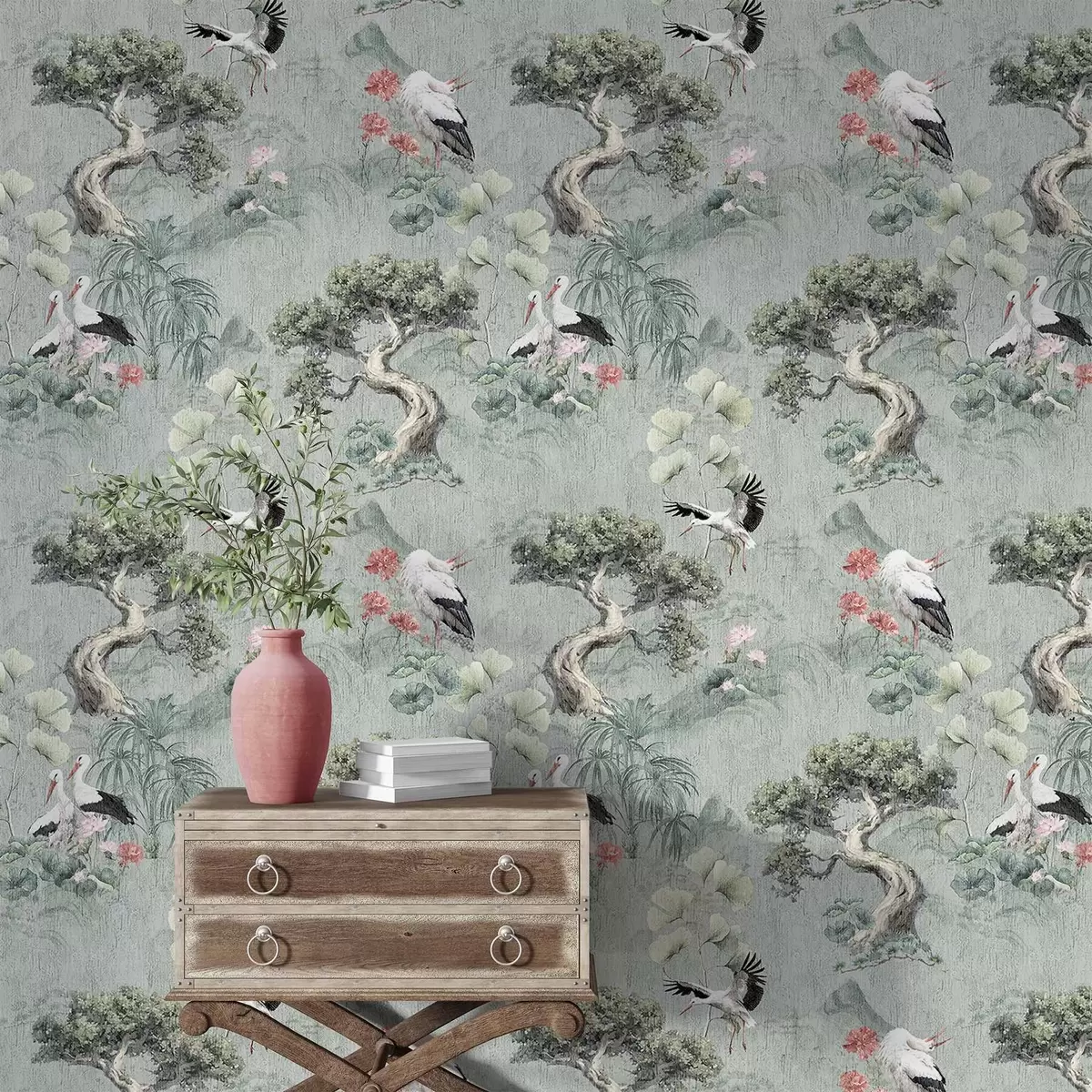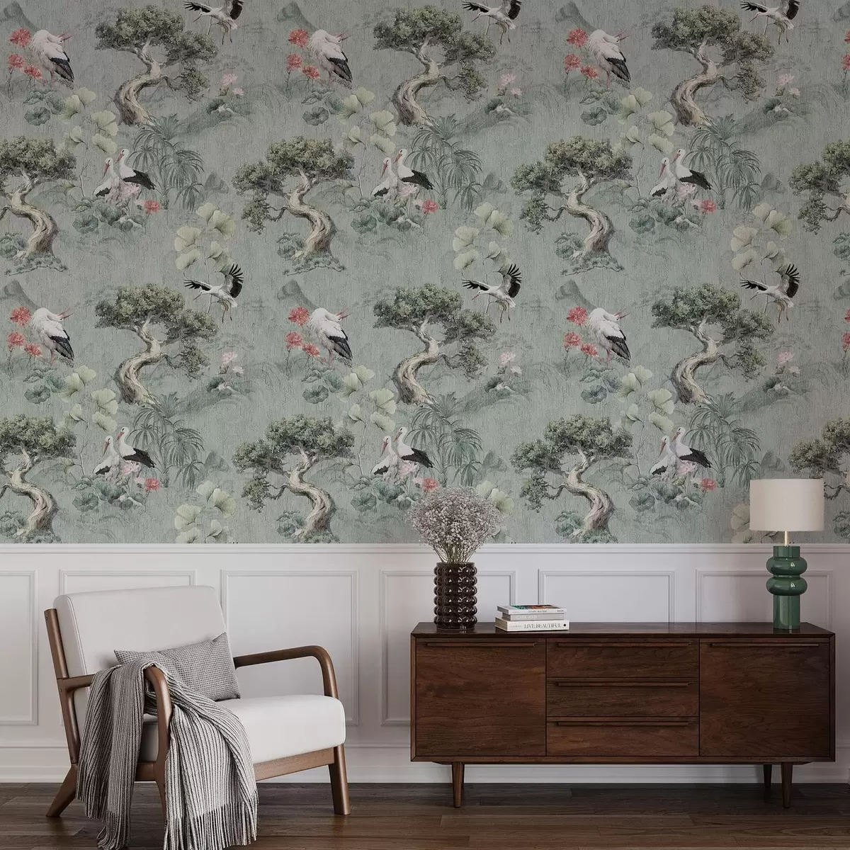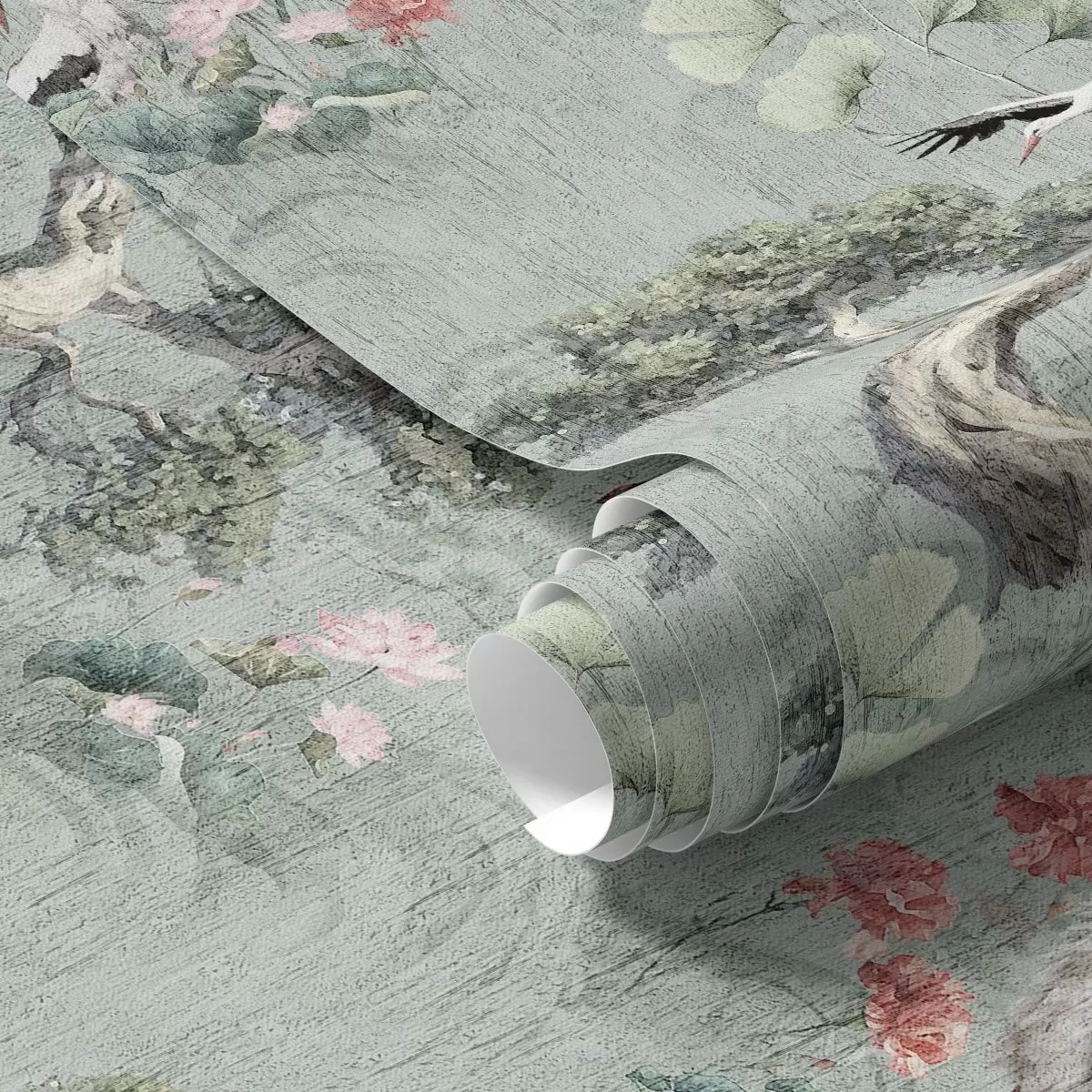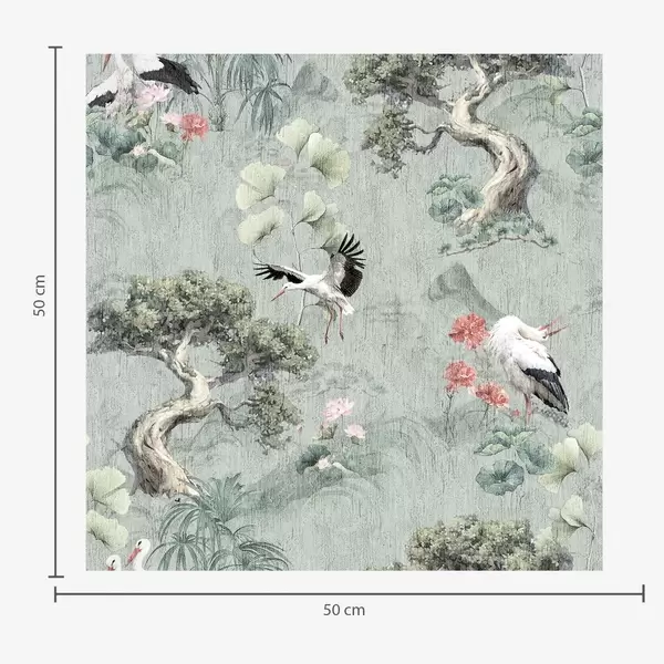 Papel tapiz Grullas entre pinos y lotos sobre un tranquilo fondo verde. Nr. a00962
