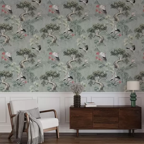Papel tapiz Grullas entre pinos y lotos sobre un tranquilo fondo verde Nr. a00962
