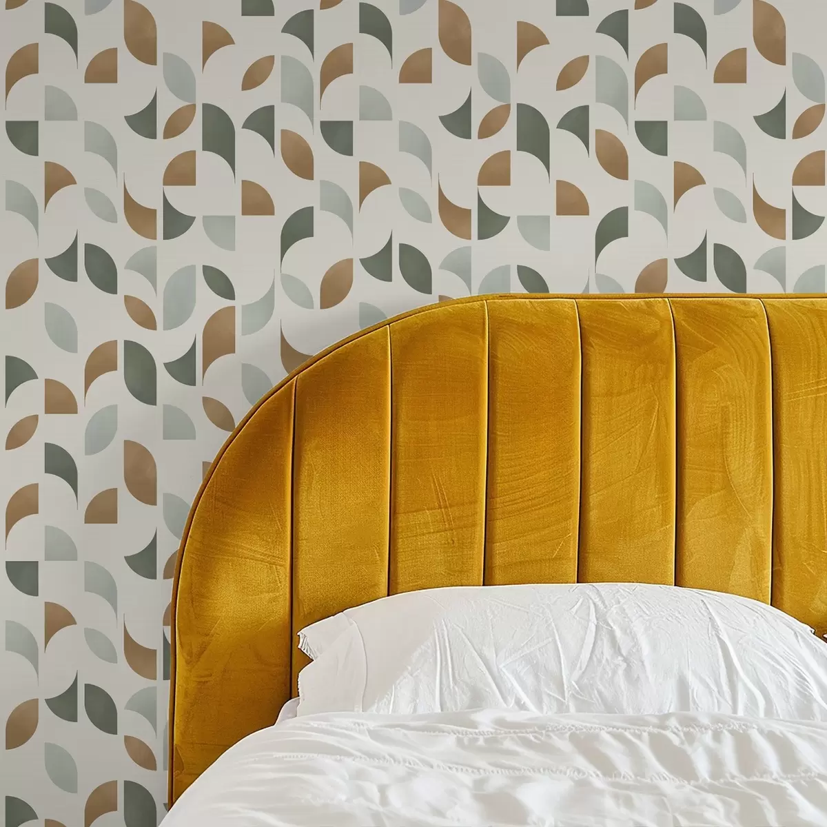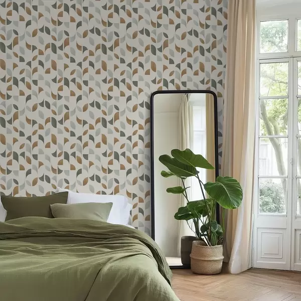 Papel tapiz Medios círculos y hojas abstractos en verde y terracota. Nr. a00985