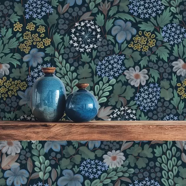 Papel tapiz Jardín nocturno con lirios azules, bayas y vegetación silvestre. Nr. a00996