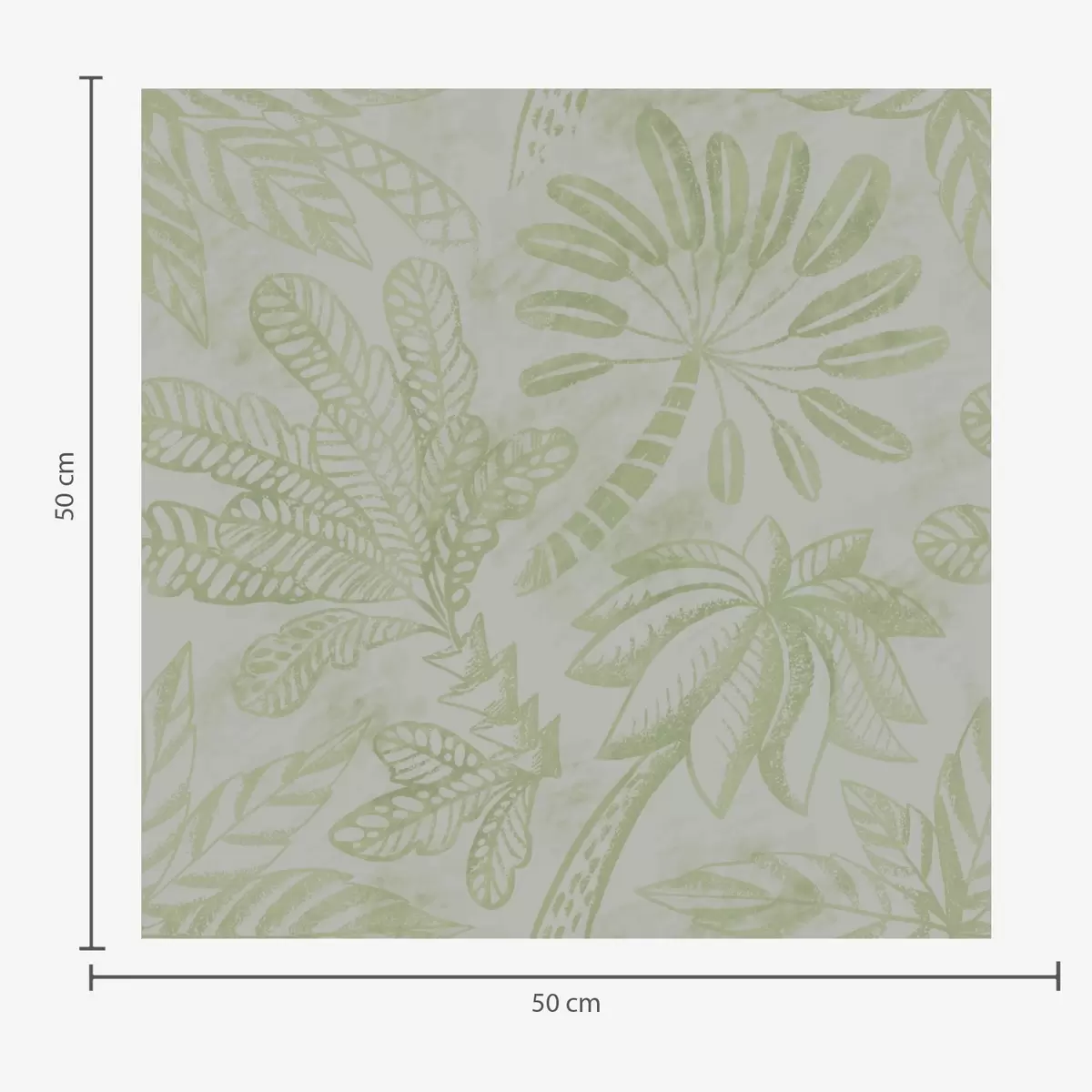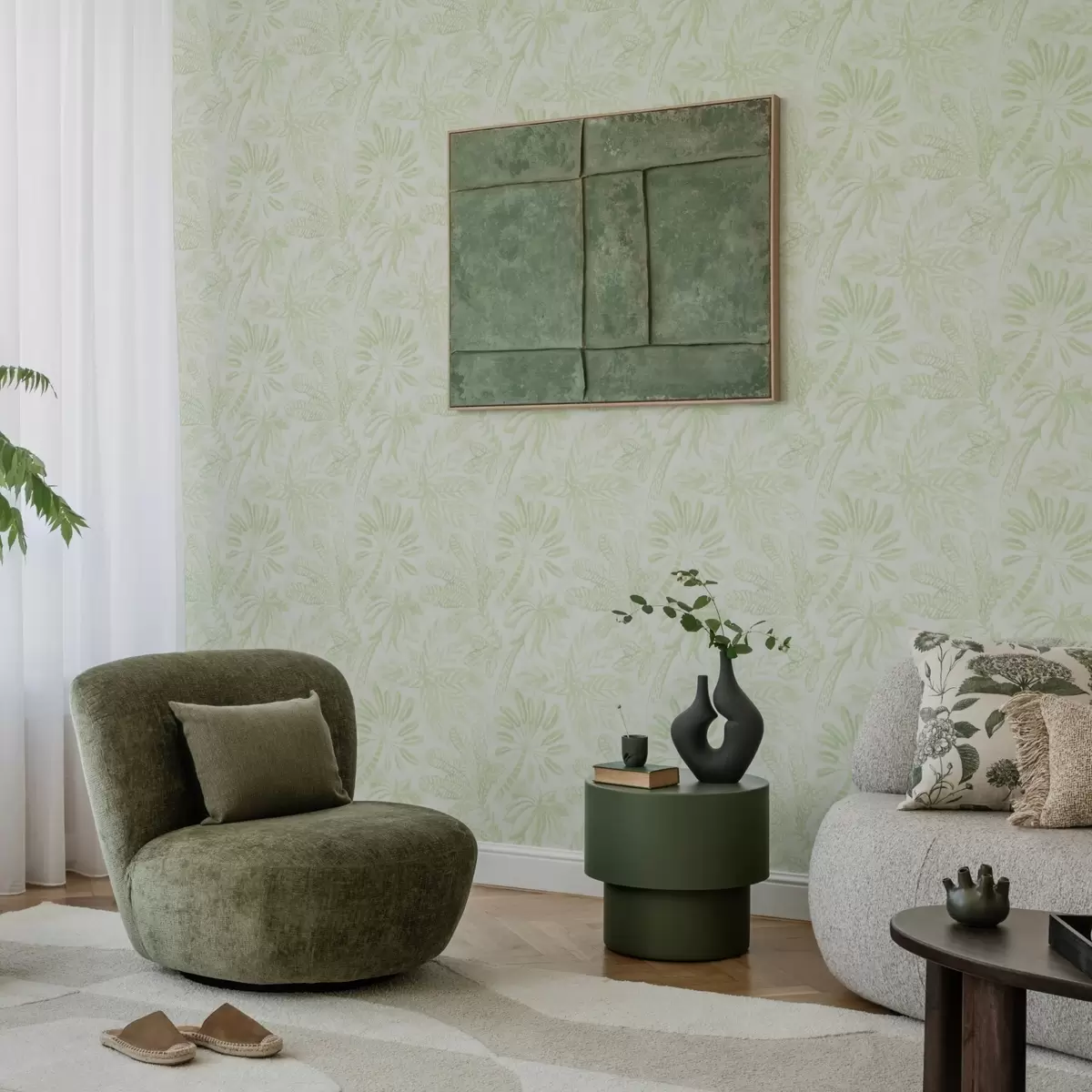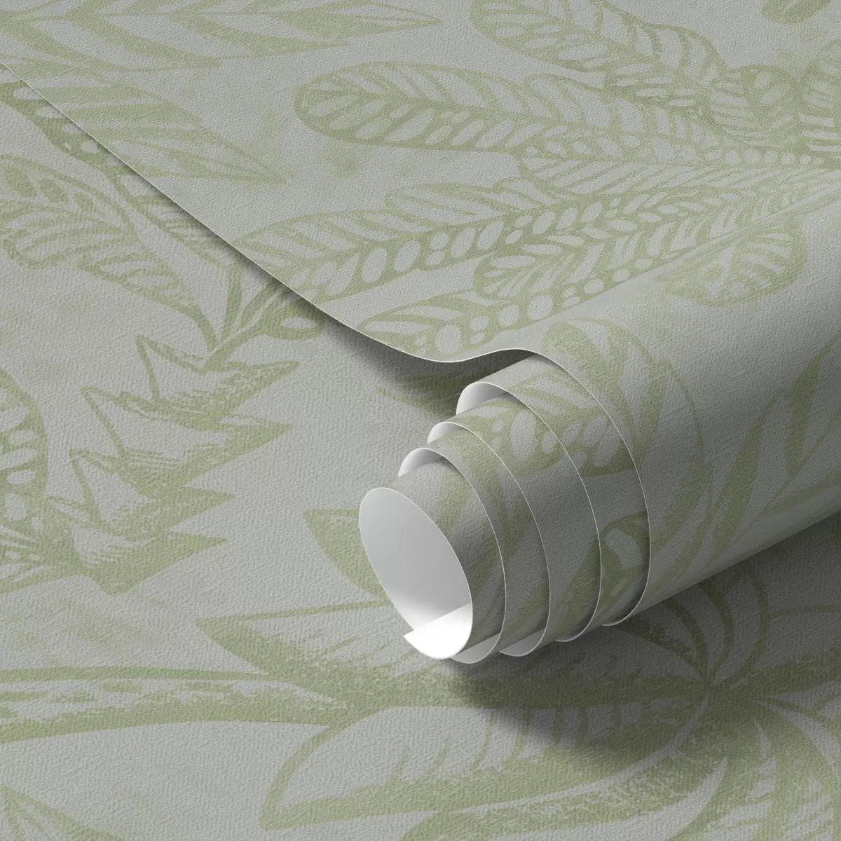 Papel tapiz Hojas tropicales esbozadas en tonos verde claro frescos. Nr. a01001v1