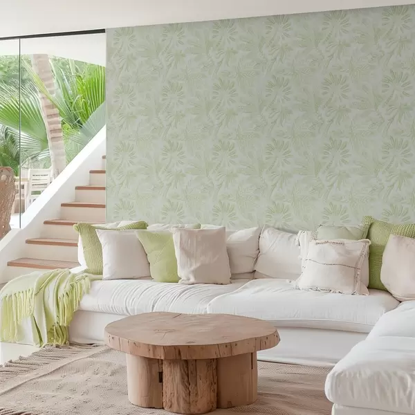 Papel tapiz Hojas tropicales esbozadas en tonos verde claro frescos Nr. a01001v1