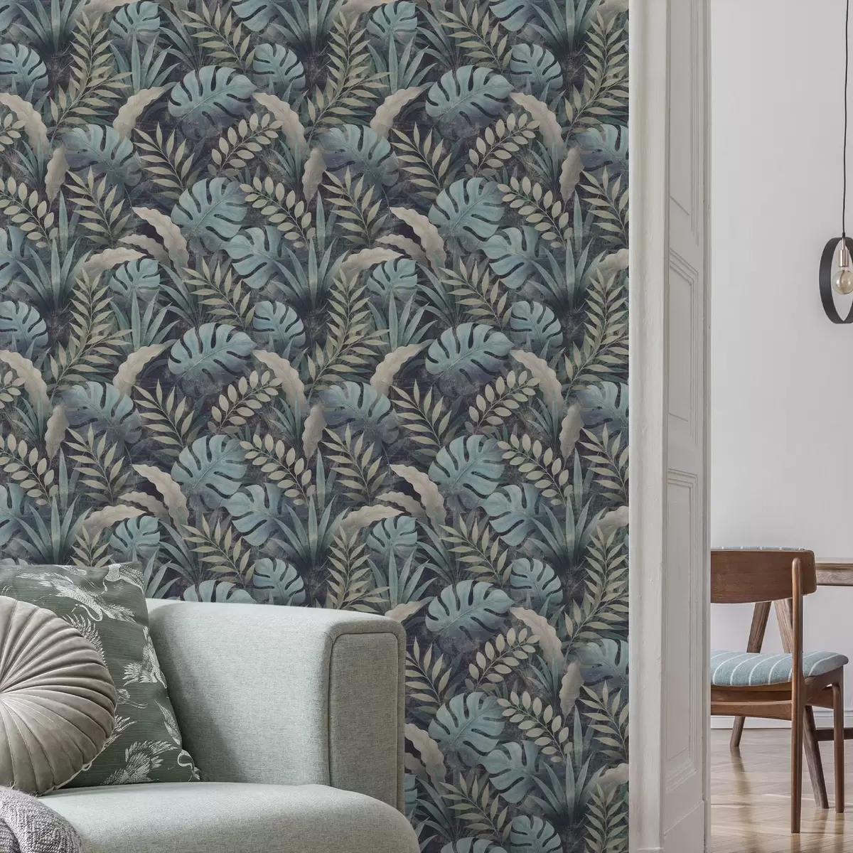 Papel tapiz Follaje tropical en tonos azul verdosos fríos Nr. a01035