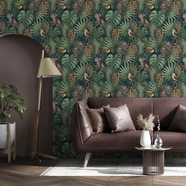 Papel tapiz Monos y aves tropicales en la densa vegetación de la selva Nr. a01037