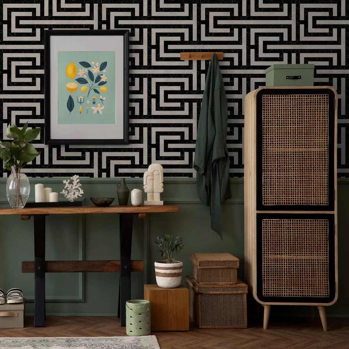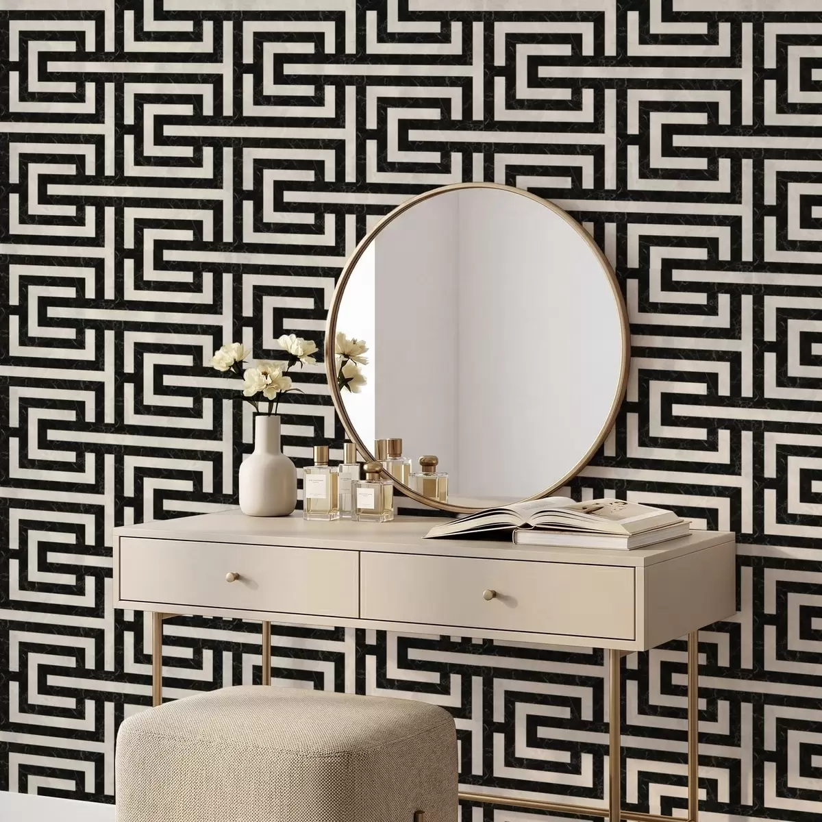 Papel tapiz Patrón geométrico en blanco y negro con forma de laberinto Nr. a01073