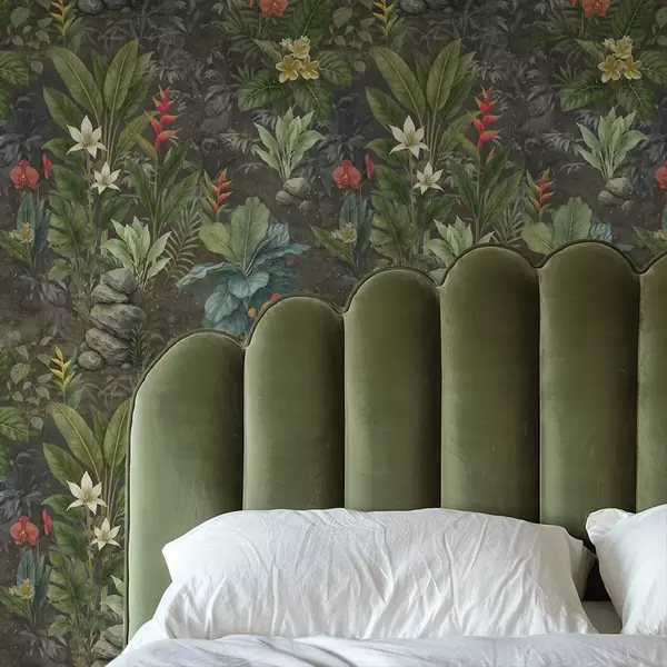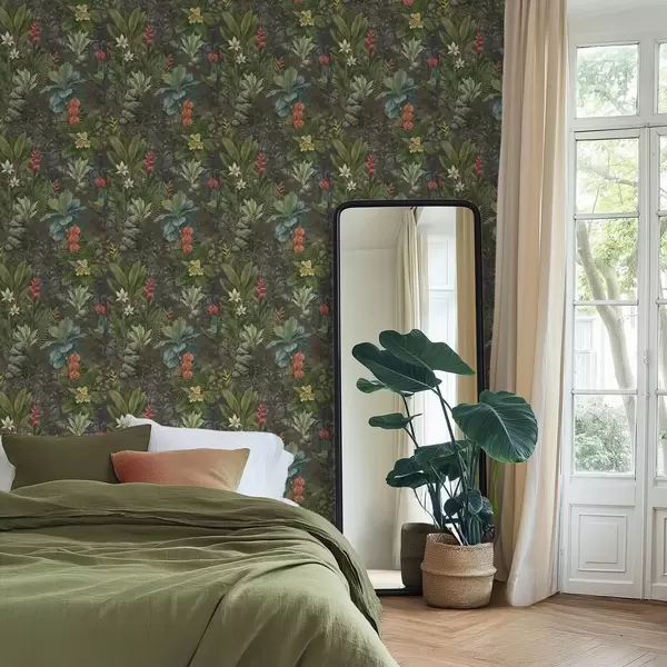 Papel tapiz Jardín tropical oscuro con flores y follaje brillantes Nr. a01079