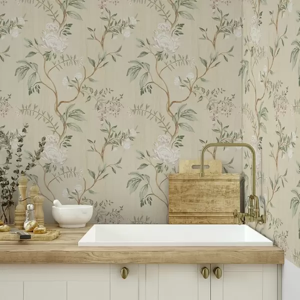 Papel tapiz Delicadas ramas con flores sobre un cálido fondo color crema. Nr. a01084