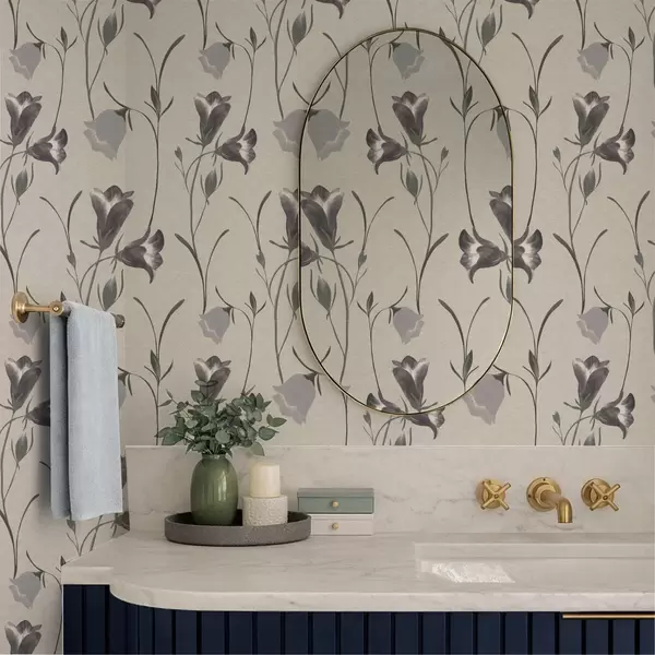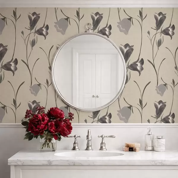 Papel tapiz Flores grises en forma de campana sobre fondo beige claro. Nr. a01119