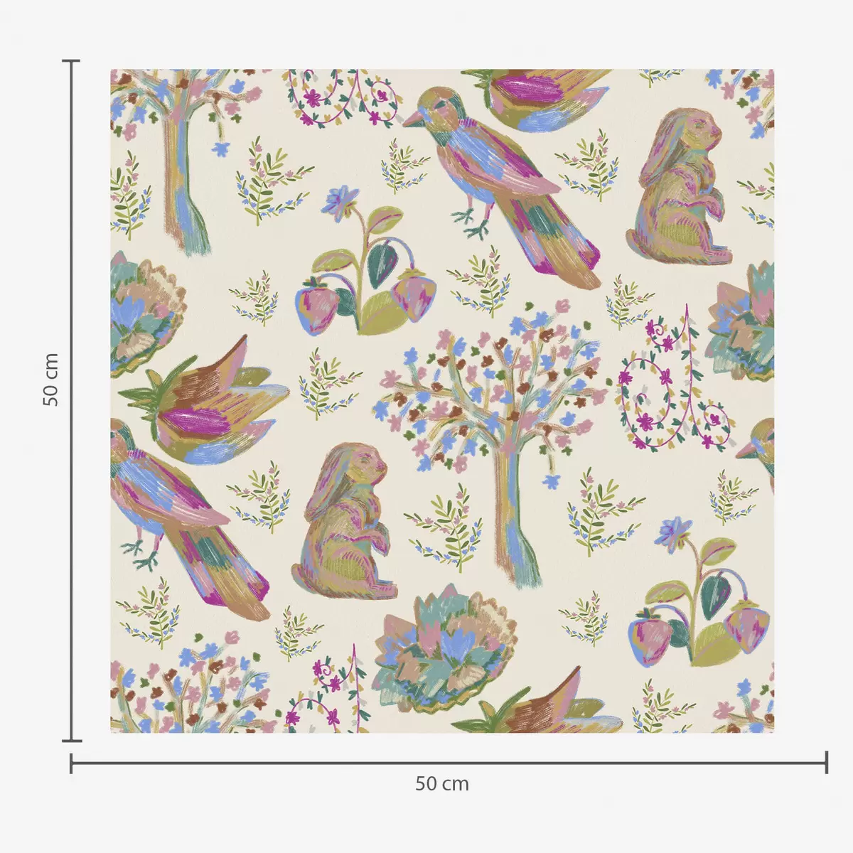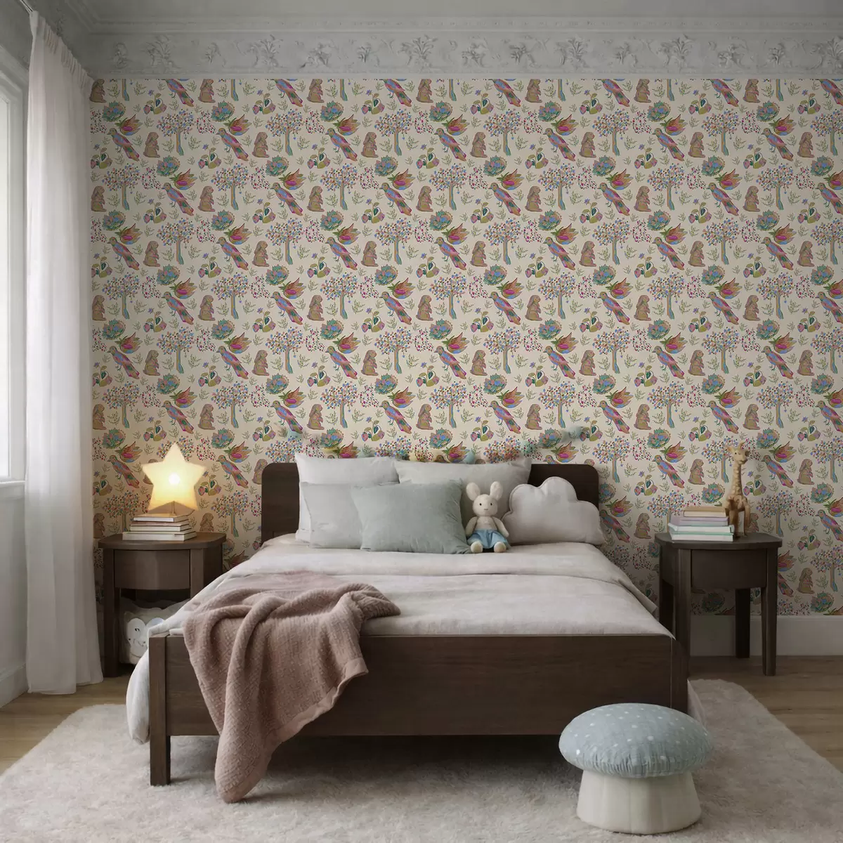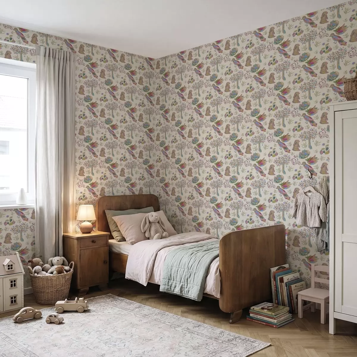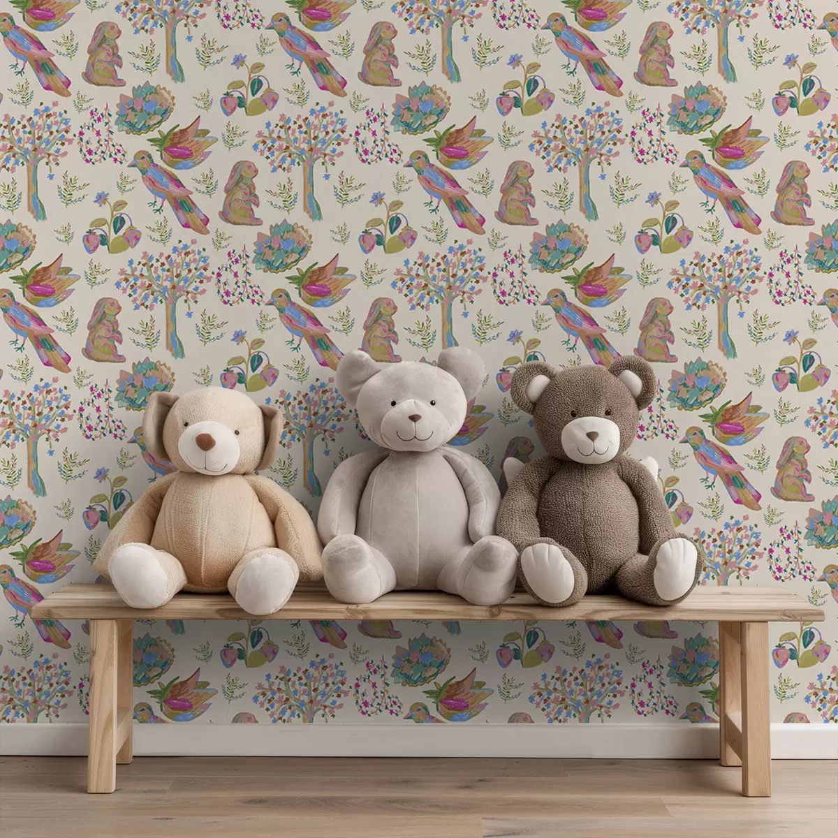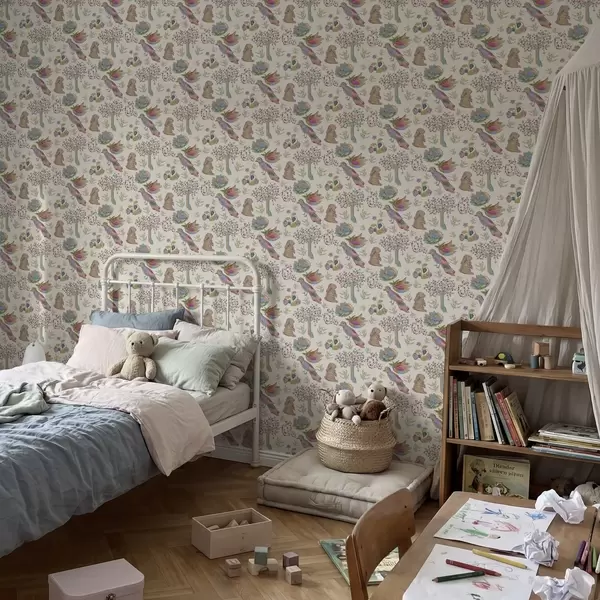 Papel tapiz Colorido estampado infantil con pájaros y conejos. Nr. a01127