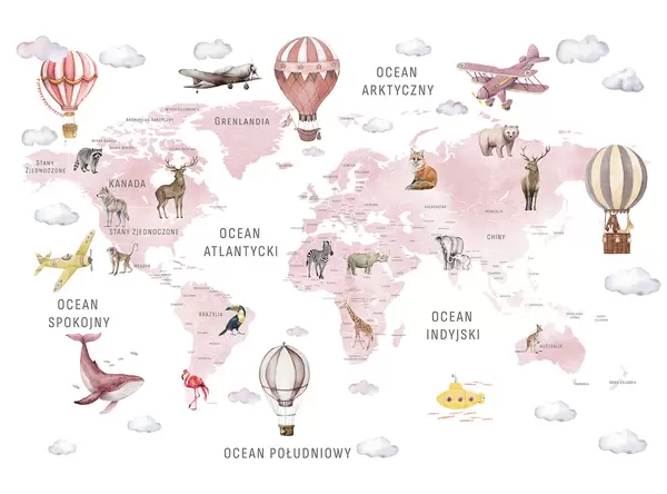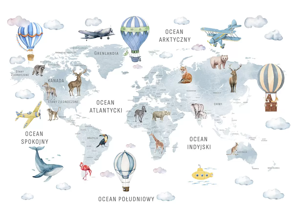 Papel tapiz Mapa infantil en estilo acuarela con animales y globos aerostáticos. Idioma polaco. Color azul. Nr. c00001plv1
