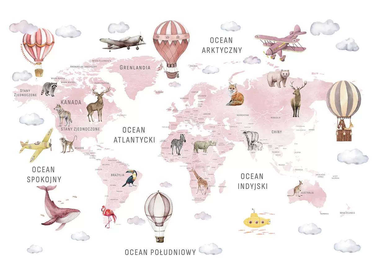 Papel tapiz Mapa infantil en estilo acuarela con animales y globos aerostáticos. Idioma polaco. Color rosa. Nr. c00001plv3
