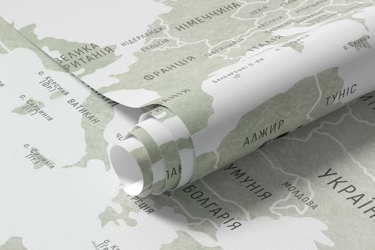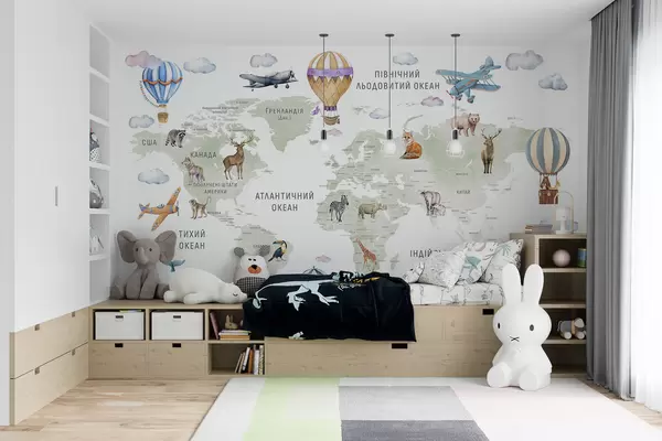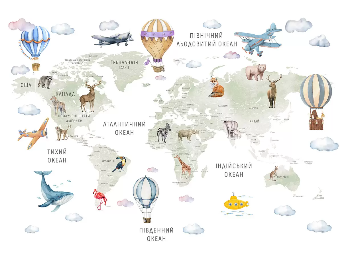 Papel tapiz Mapa infantil en estilo acuarela con animales y globos aerostáticos. Idioma ucraniano. Color verde. Nr. c00001uk