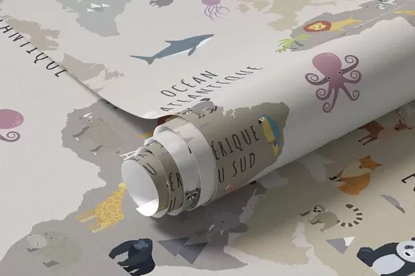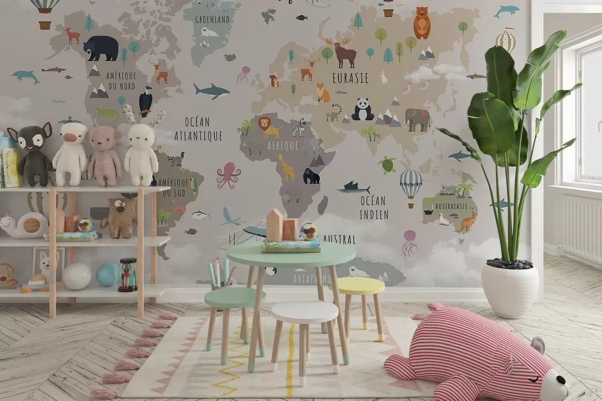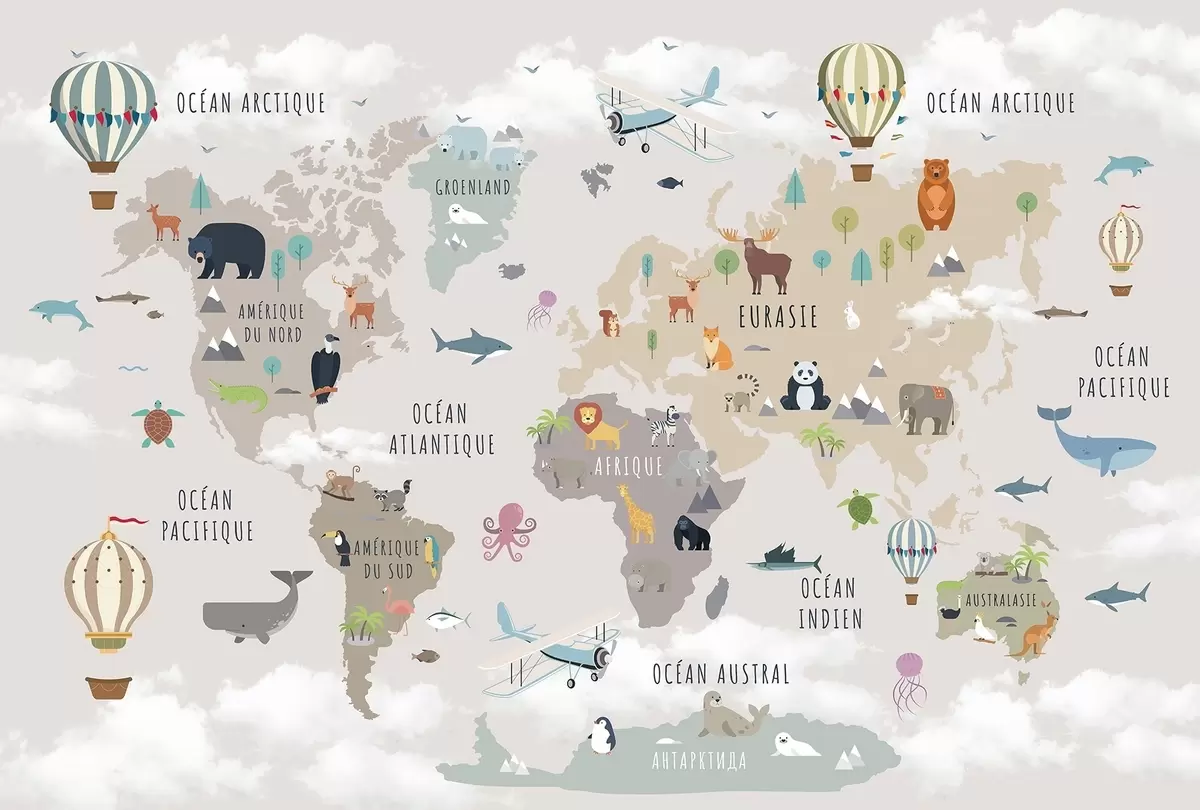 Papel tapiz Mapa del mundo infantil con animales y globos aerostáticos. Idioma francés. Nr. c00002fr