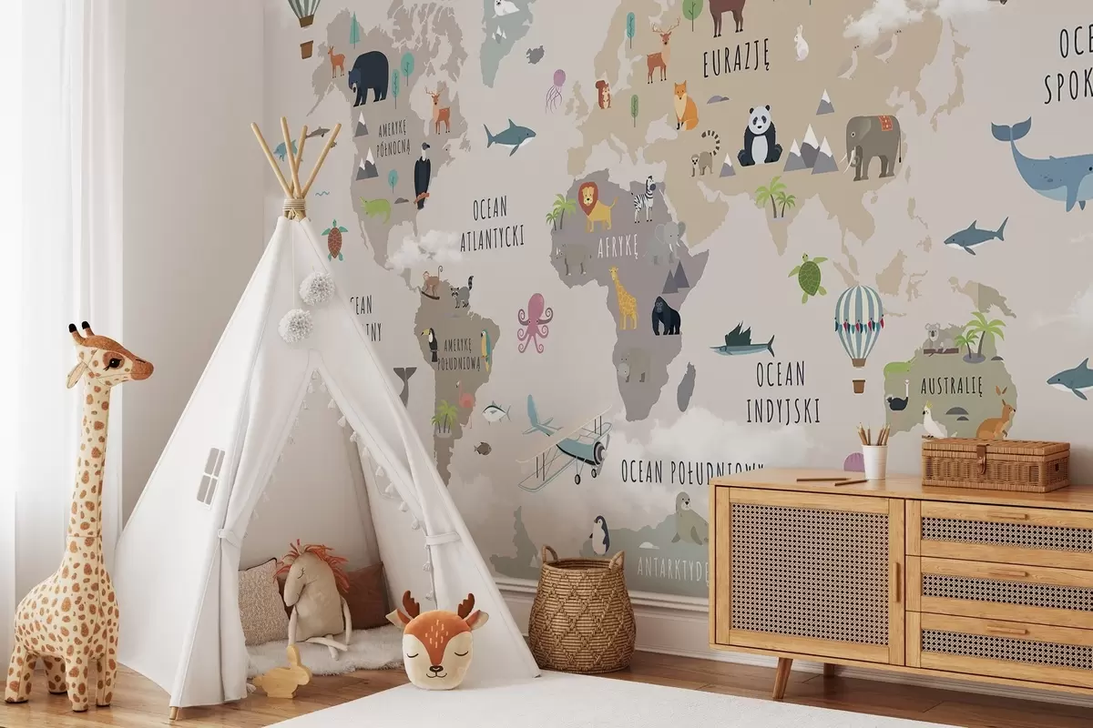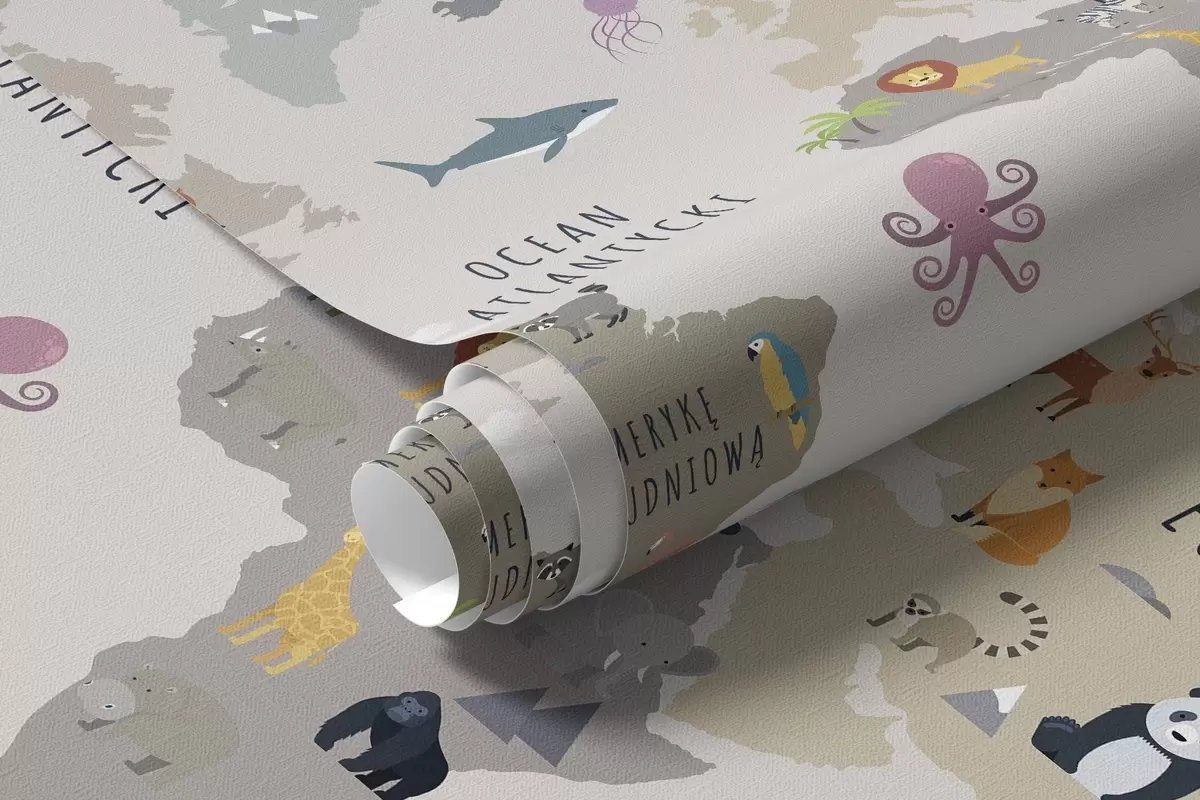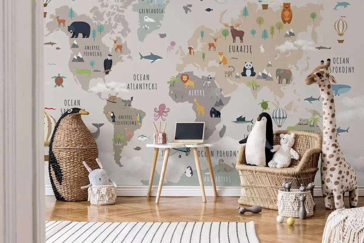 Papel tapiz Mapa mundial infantil con animales y globos aerostáticos. Idioma polaco. Nr. c00002pl