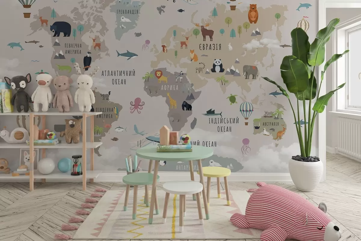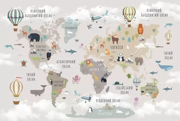 Papel tapiz Mapa mundial infantil con animales y globos aerostáticos. Idioma ucraniano. Nr. c00002uk